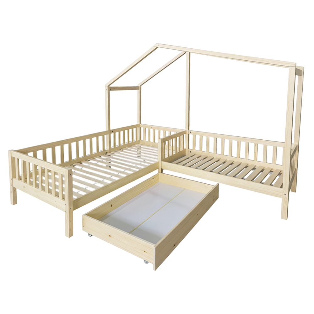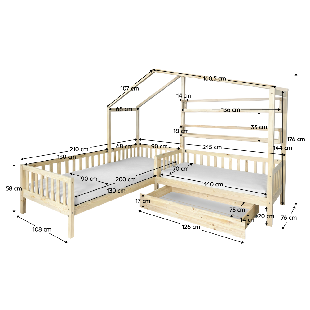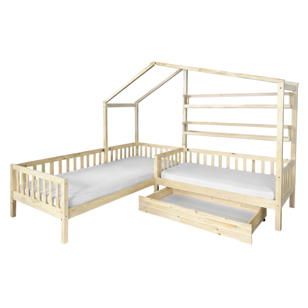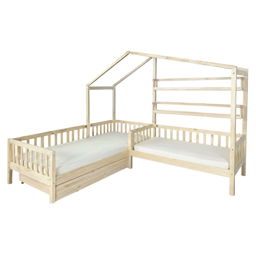 Posteľ s roštom pre 2 deti, 90x200+70x140 cm, prírodná, ENOLA