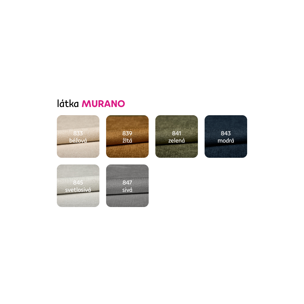 Možnosť objednania v 6 farebných prevedeniach látky Murano v cene 719 Eur. Pri individuálnej objednávke je potrebné zaplatiť 20% zálohu z danej sumy. Po uhradení zálohy bude Vaša požiadavka zadaná do výroby. Dodacia lehota 6-8 týždňov.