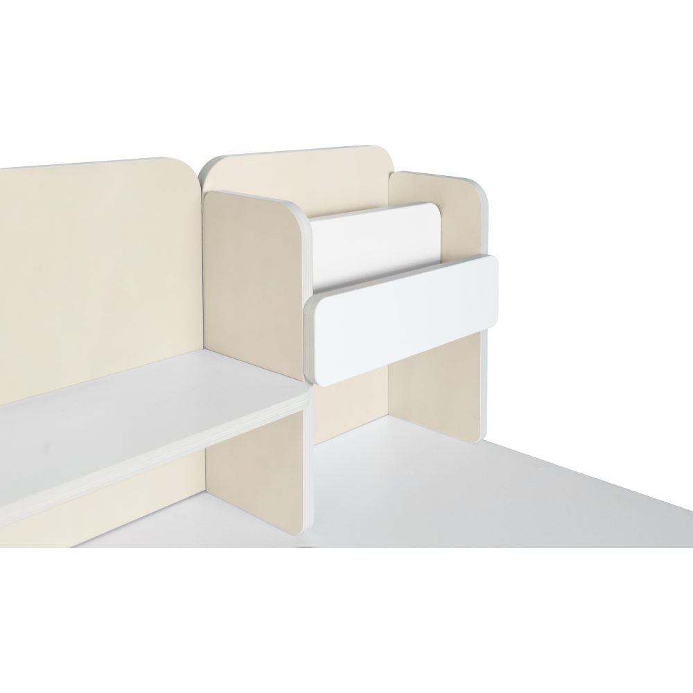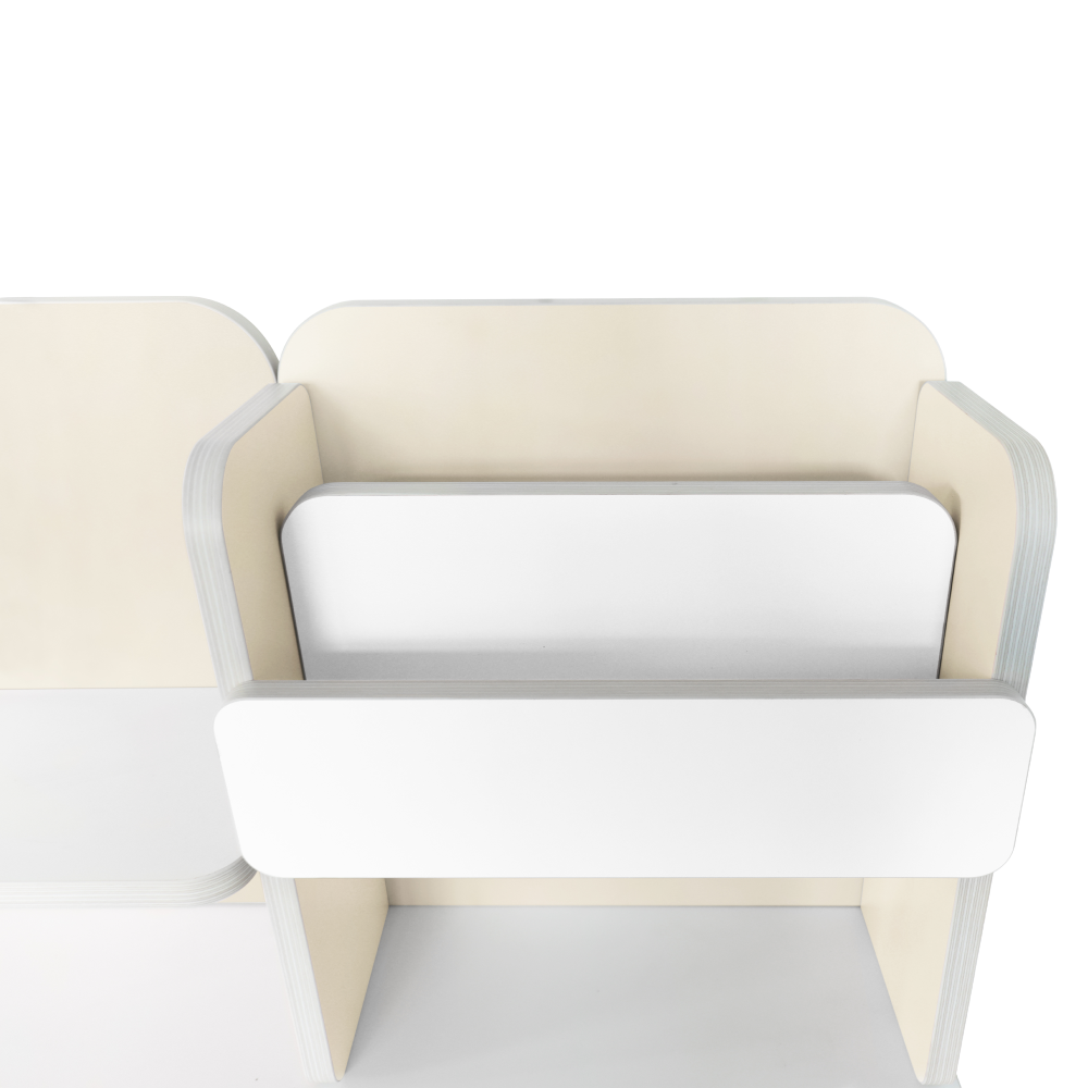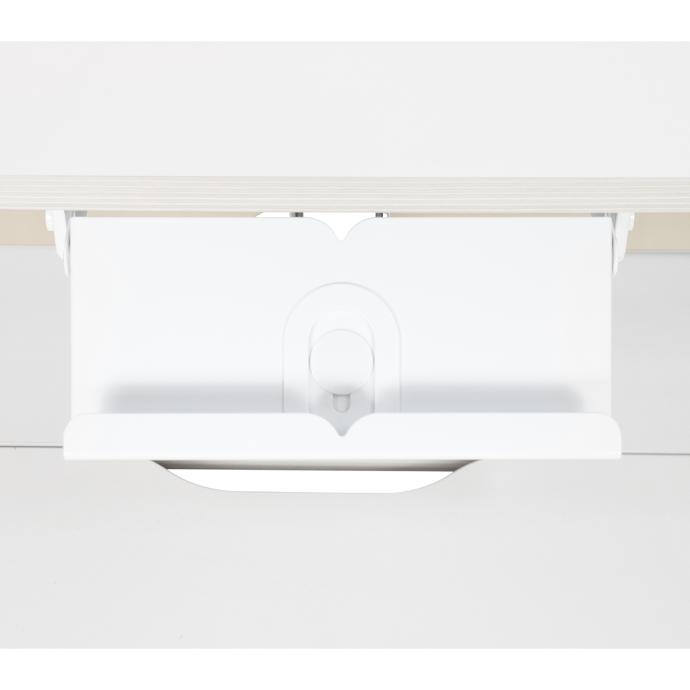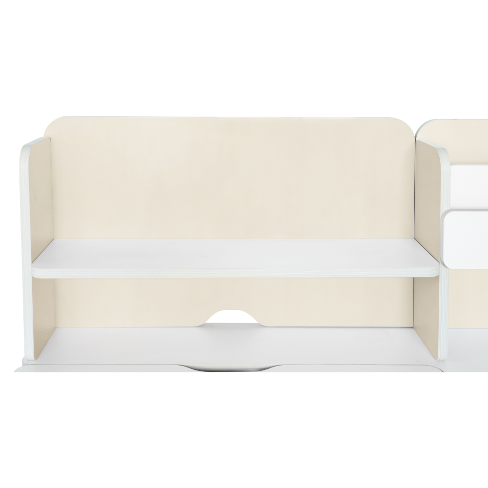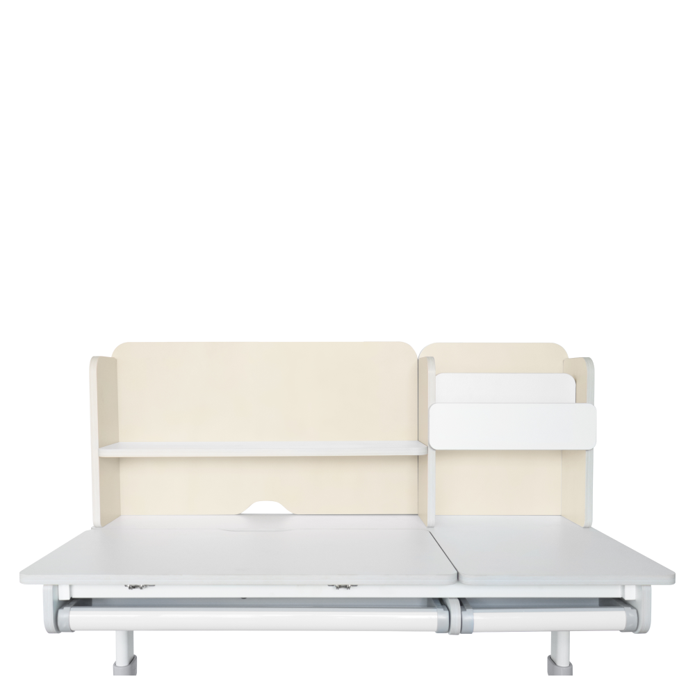 Zadný panel obsahuje police, držiak na knihy a otvor na vedenie káblov