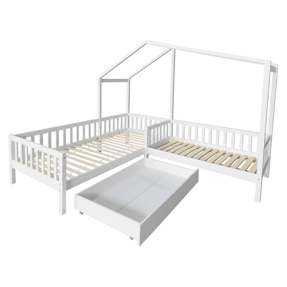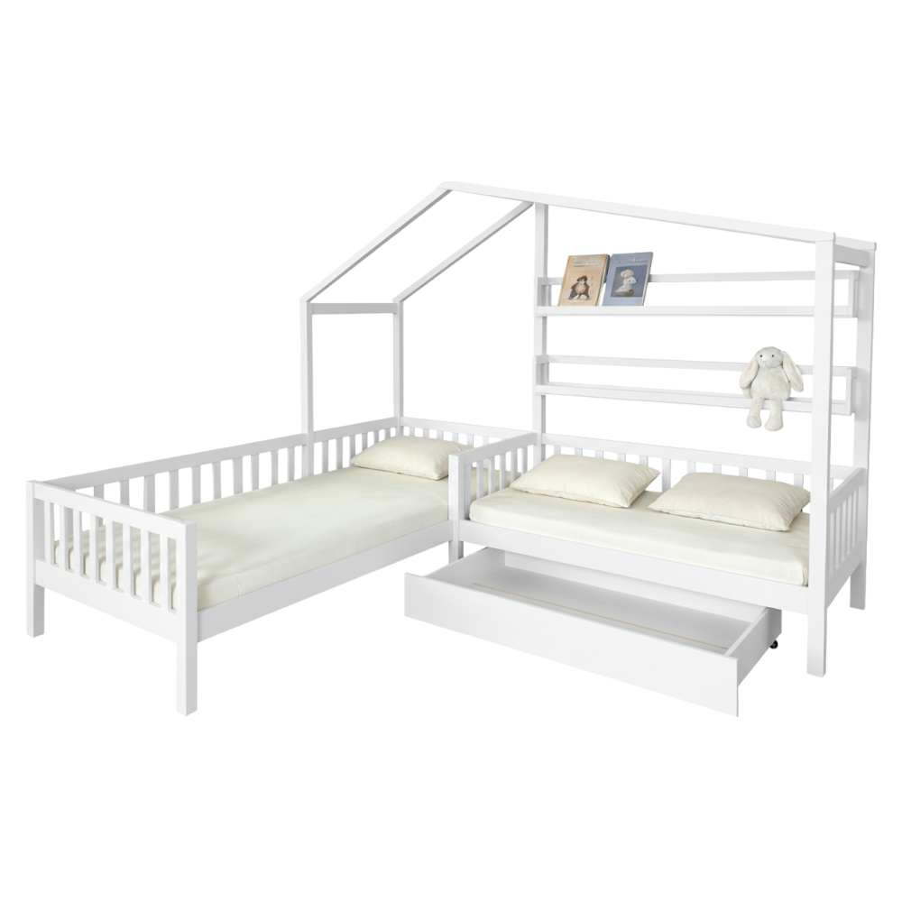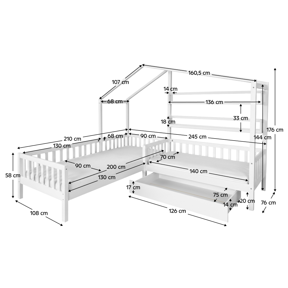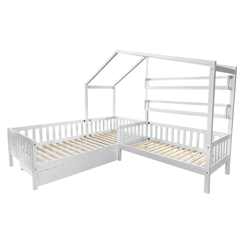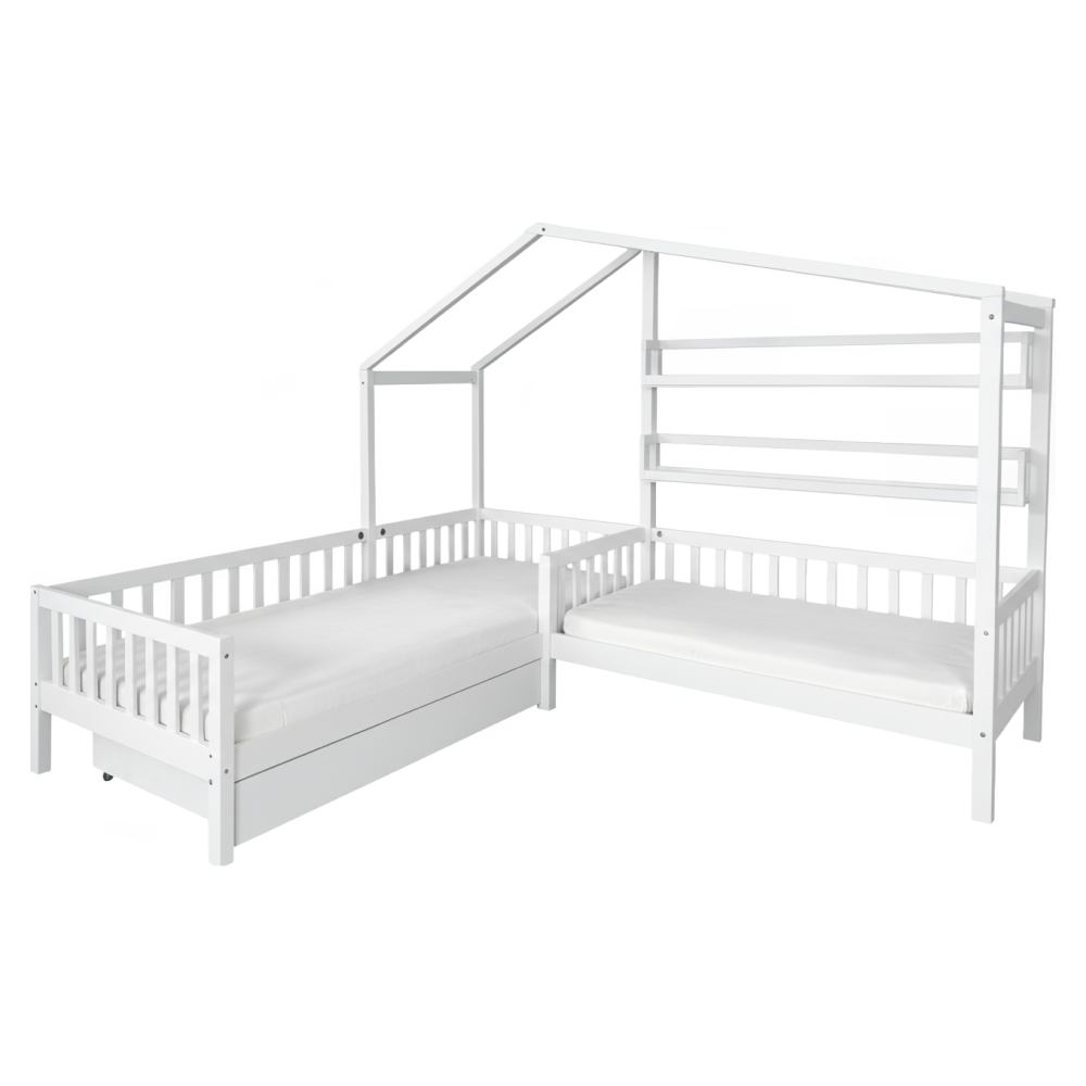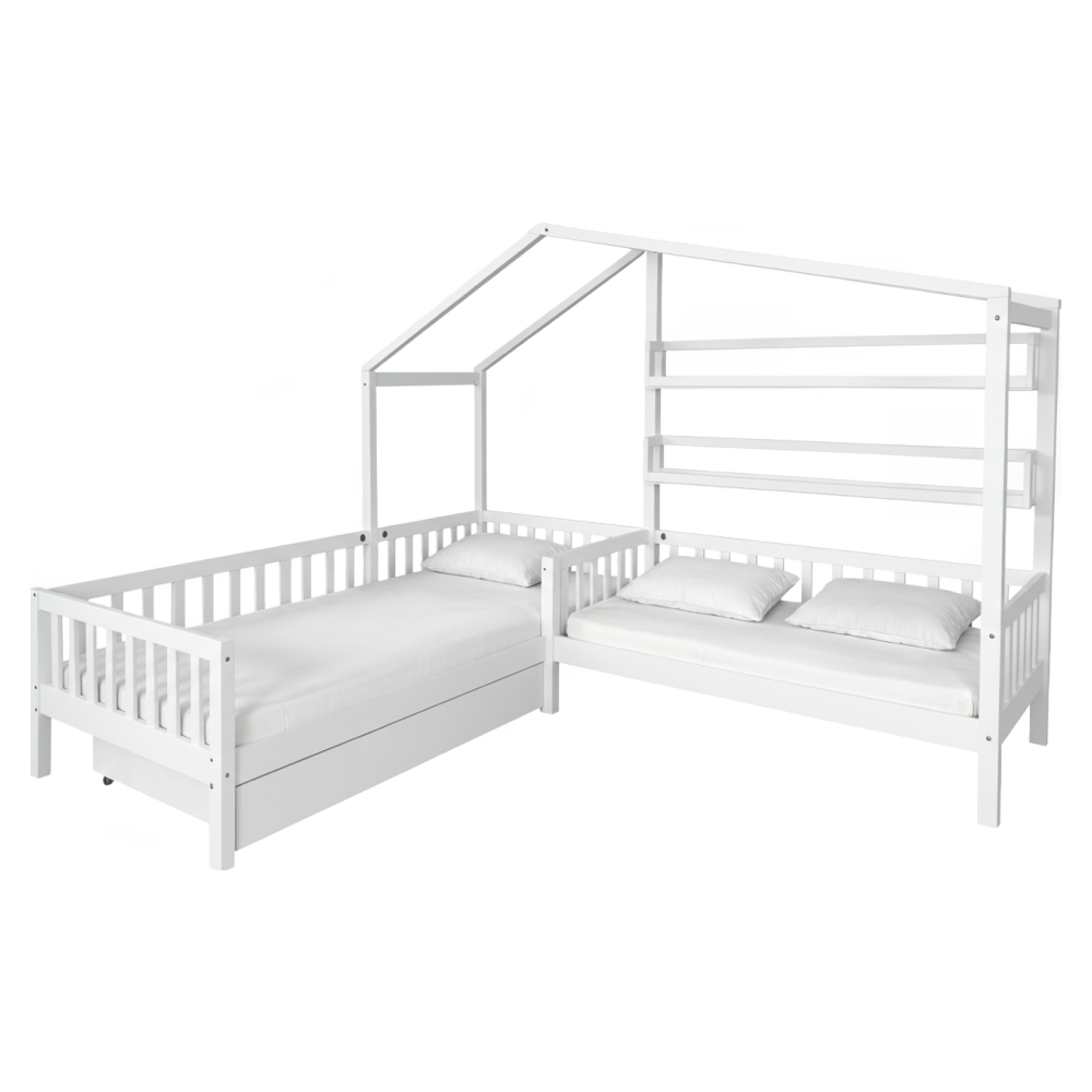 Posteľ s roštom pre 2 deti, 90x200+70x140 cm, biela, ENOLA