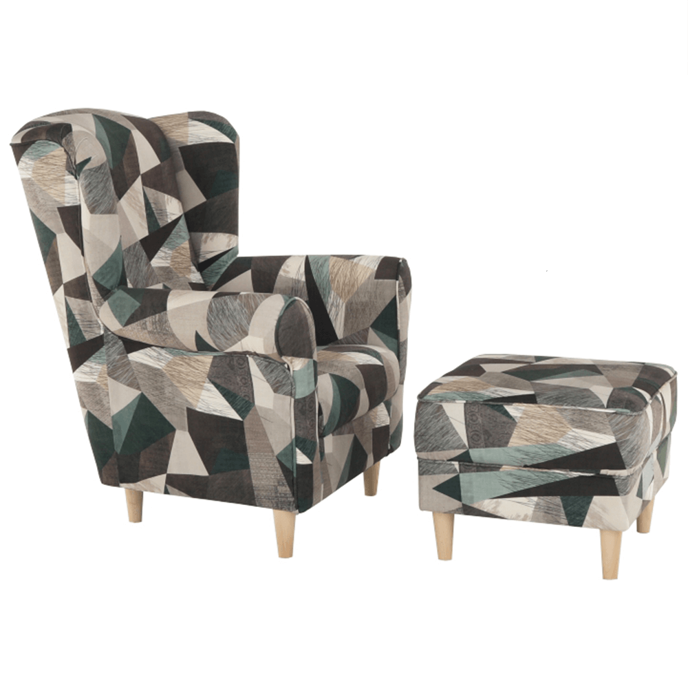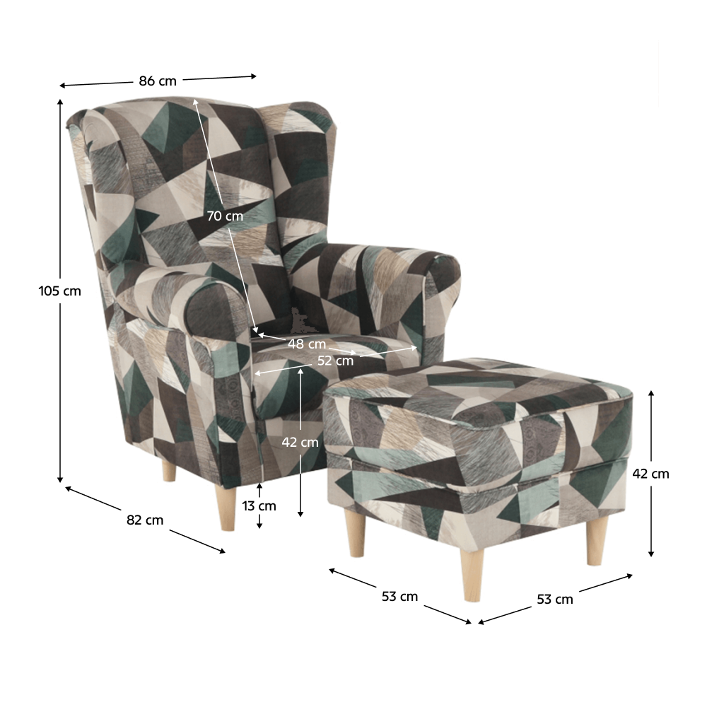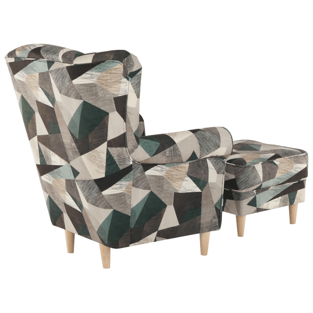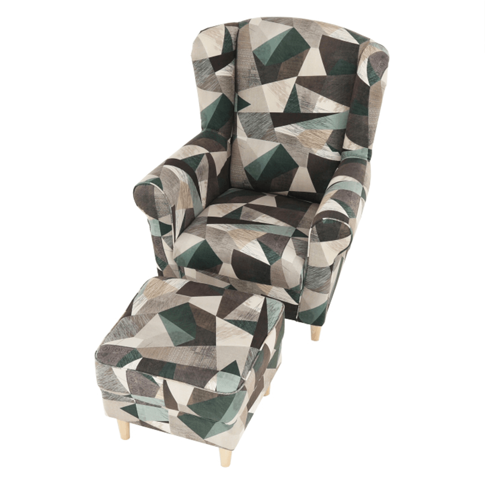 Kreslo ušiak s taburetom, látka hnedo-zelená vzor, ASTRID