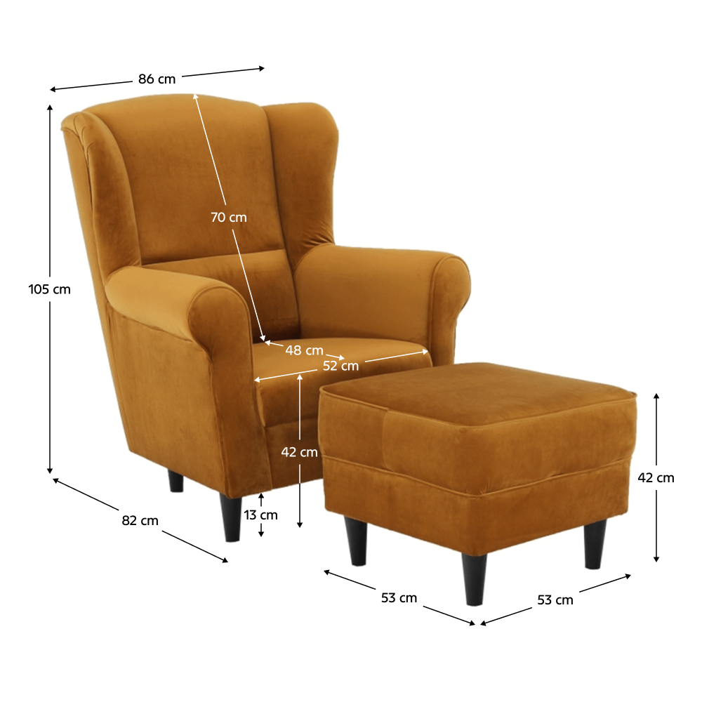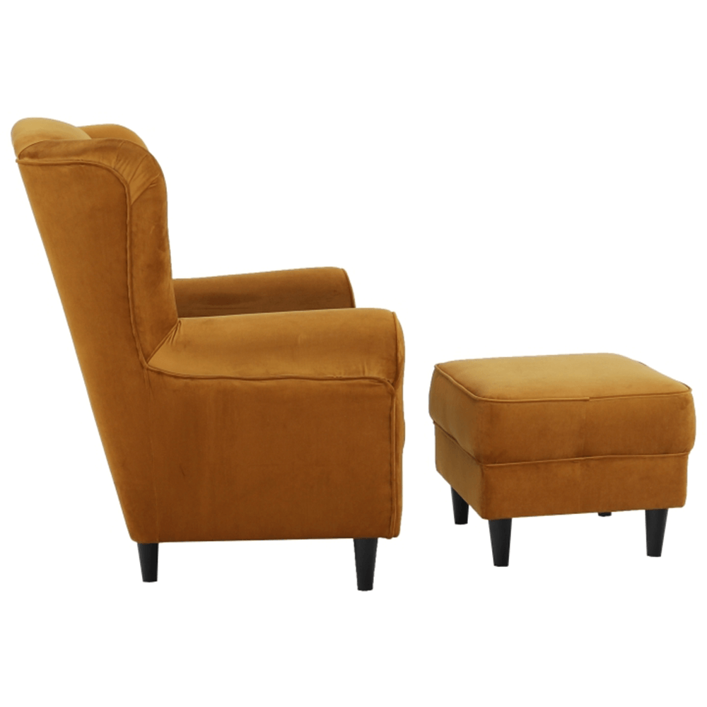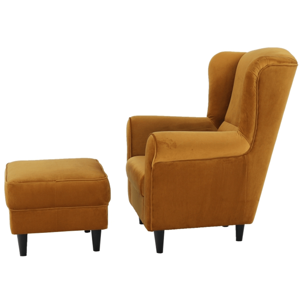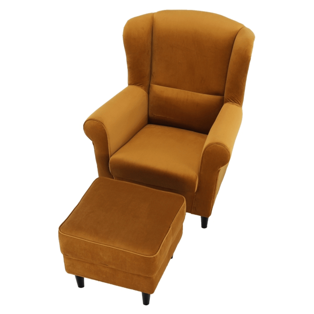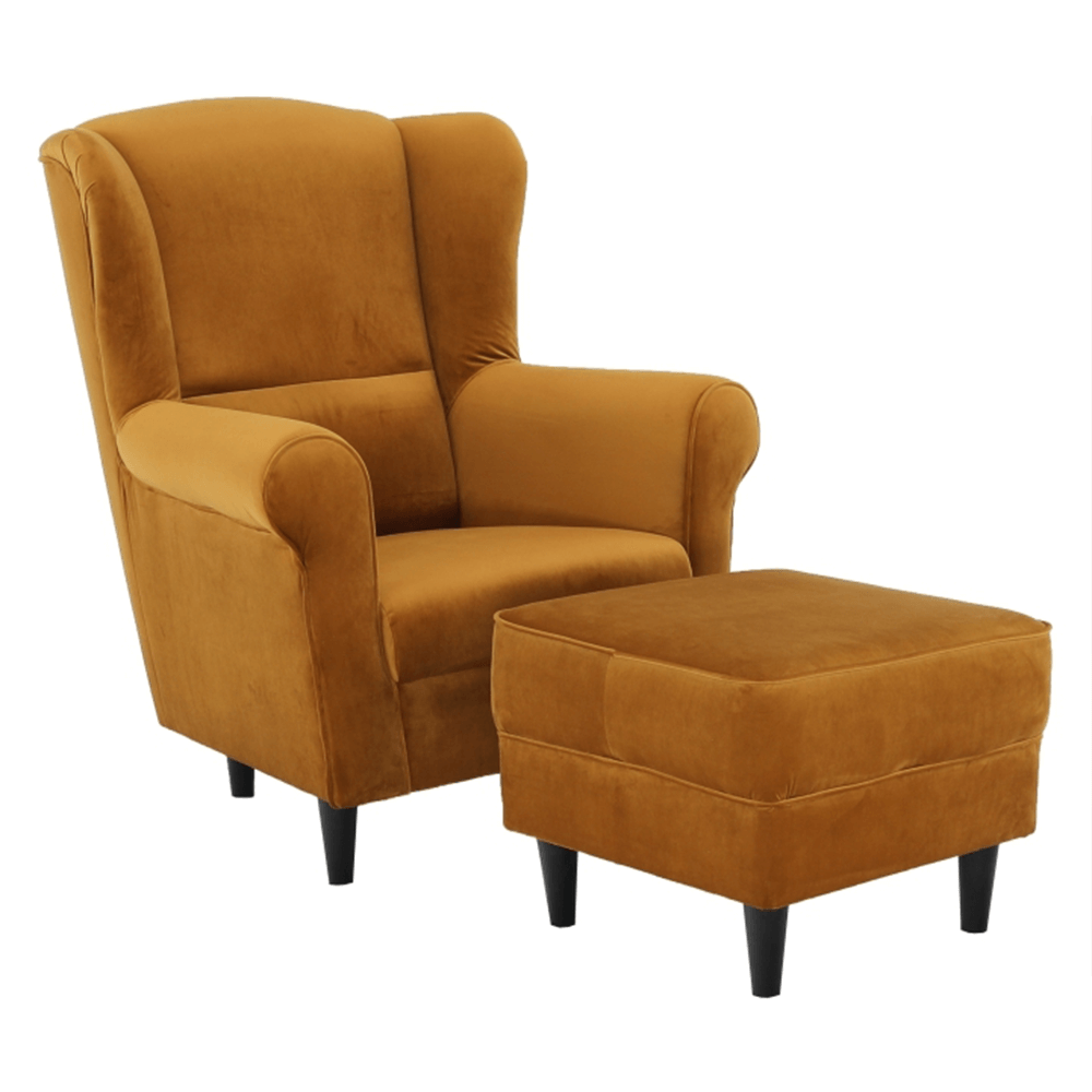 Kreslo ušiak s taburetom, látka horčicová, ASTRID