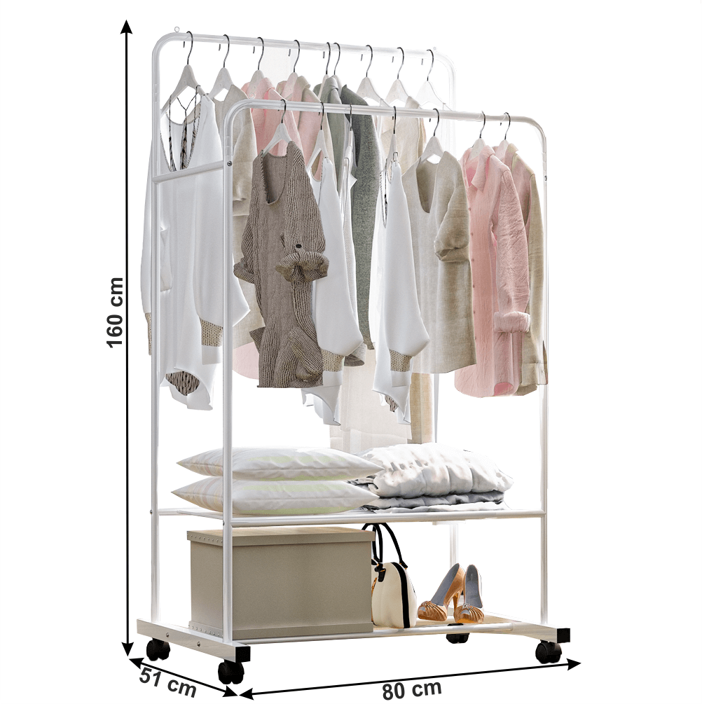 Dvojradový pojazdný vešiak, s policami, biela, RAINER
