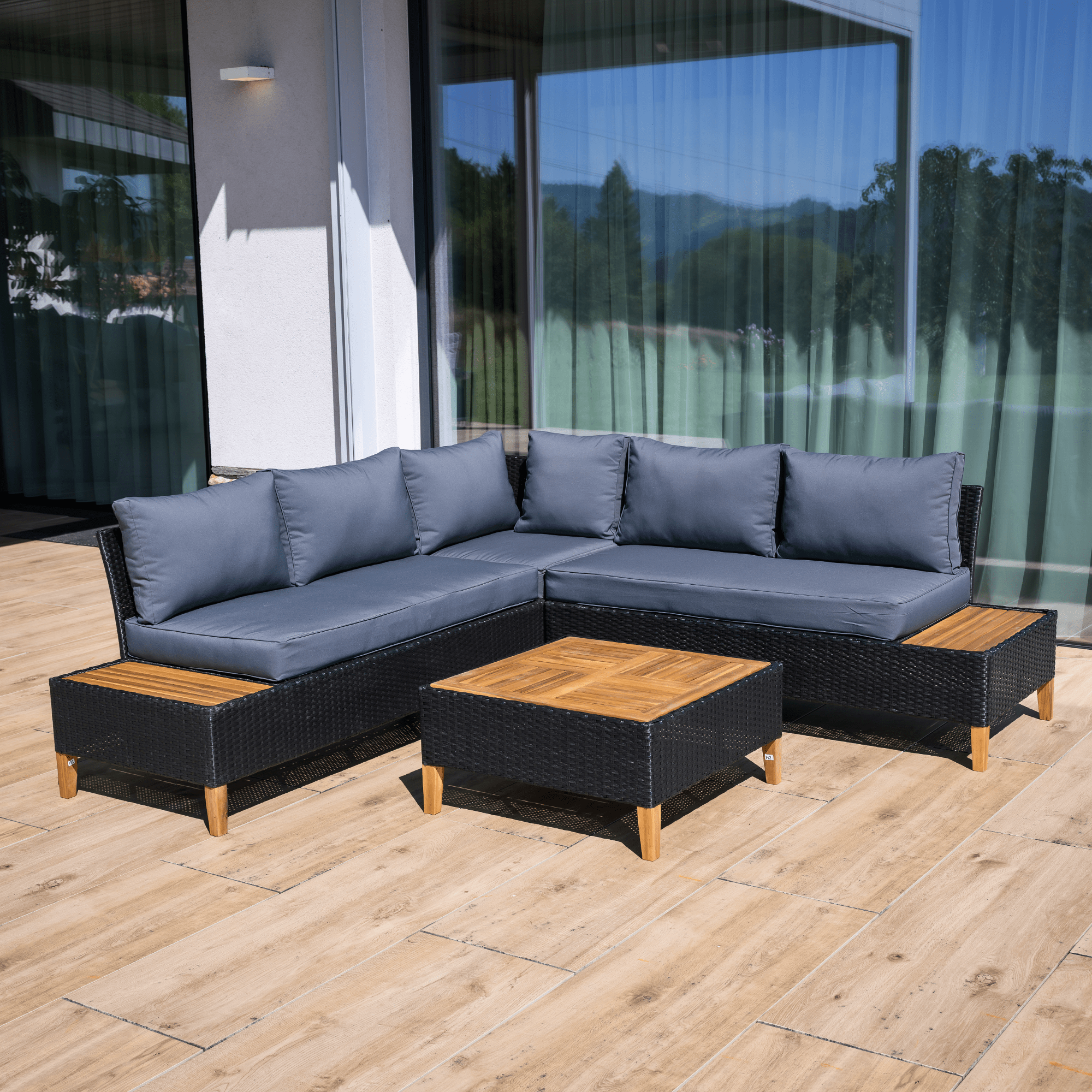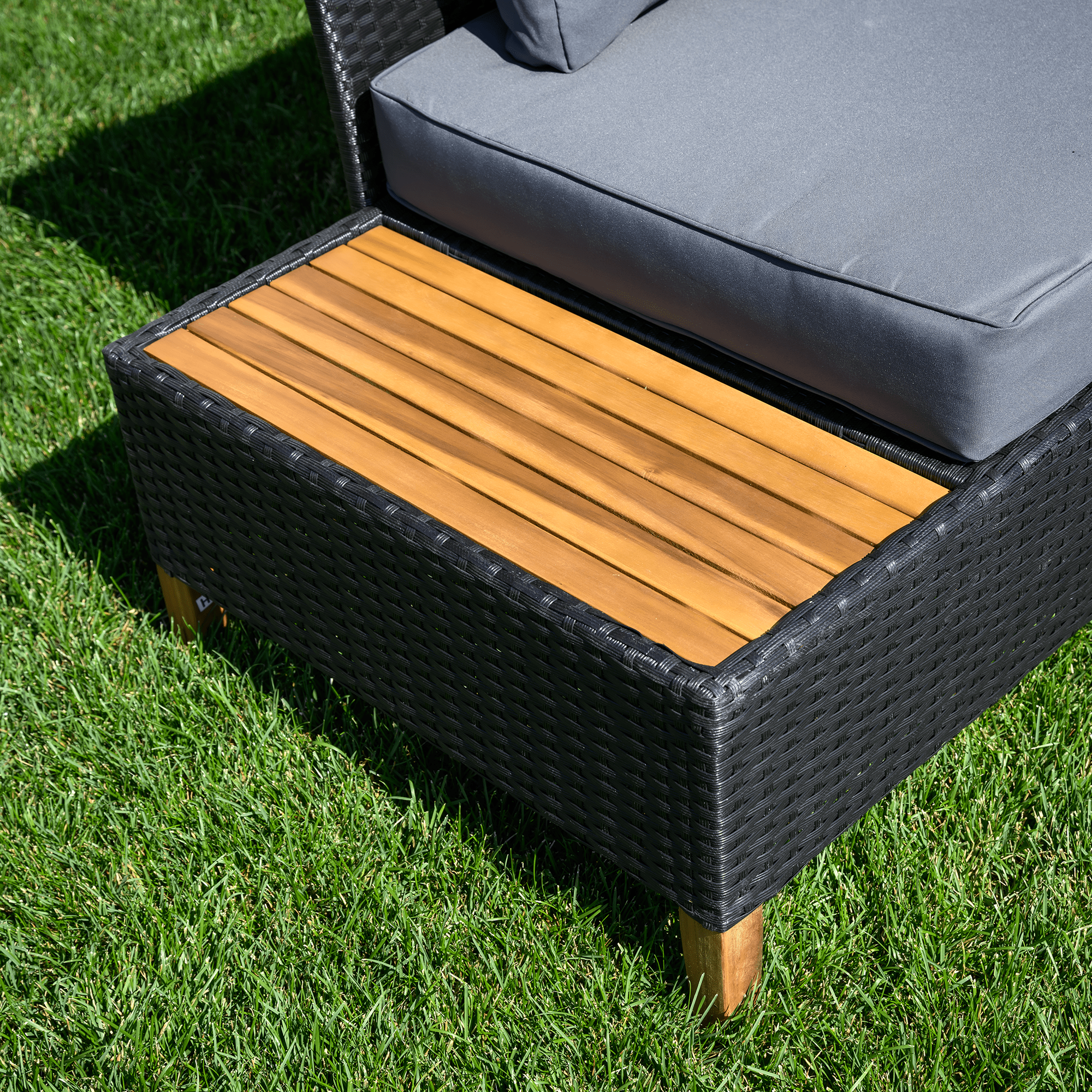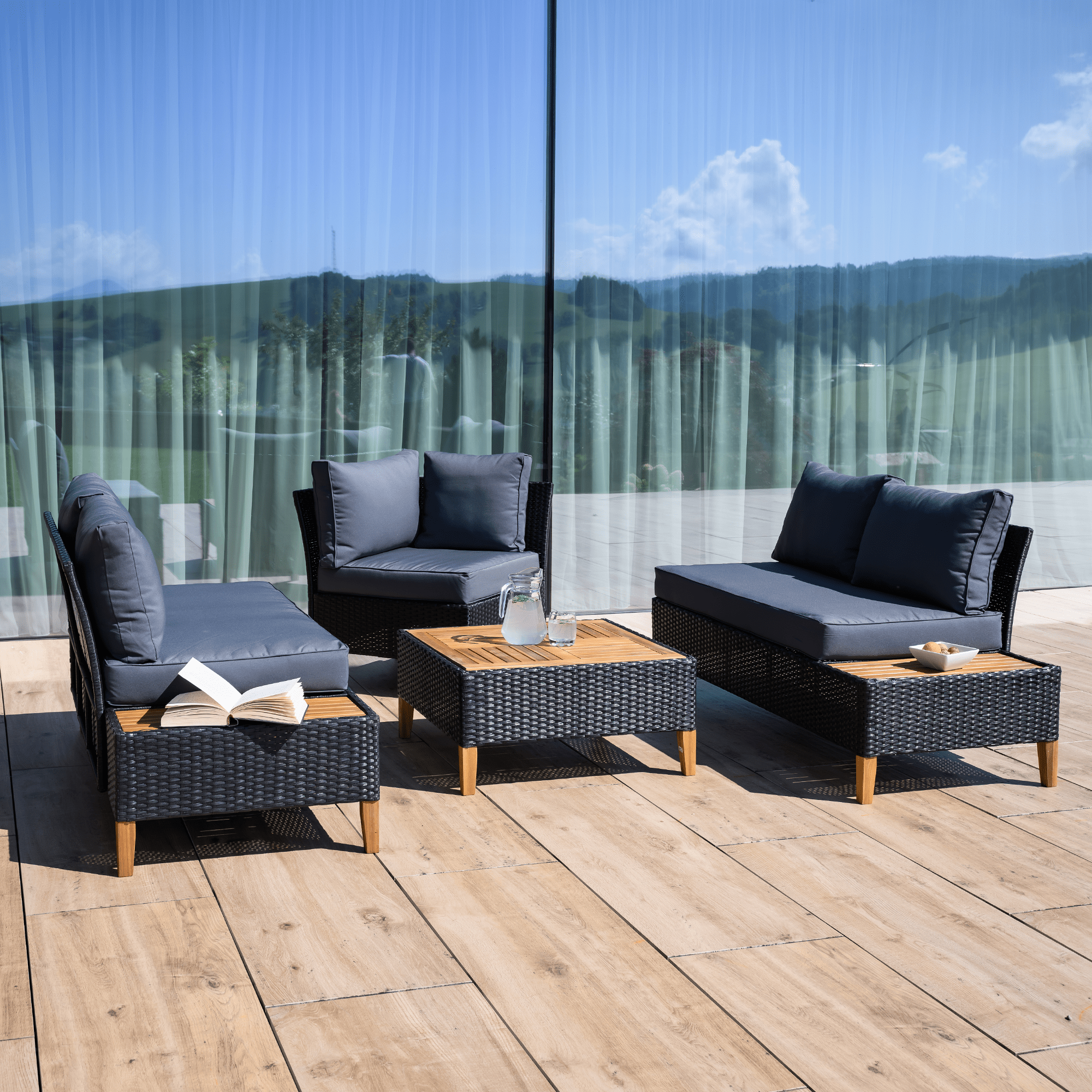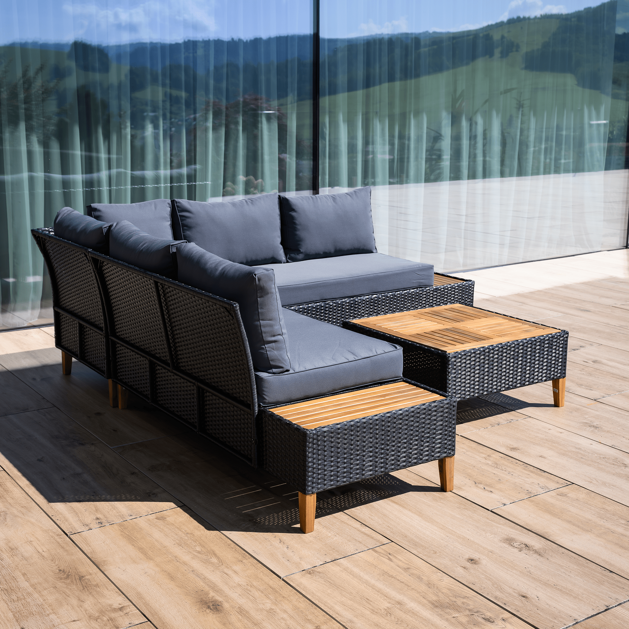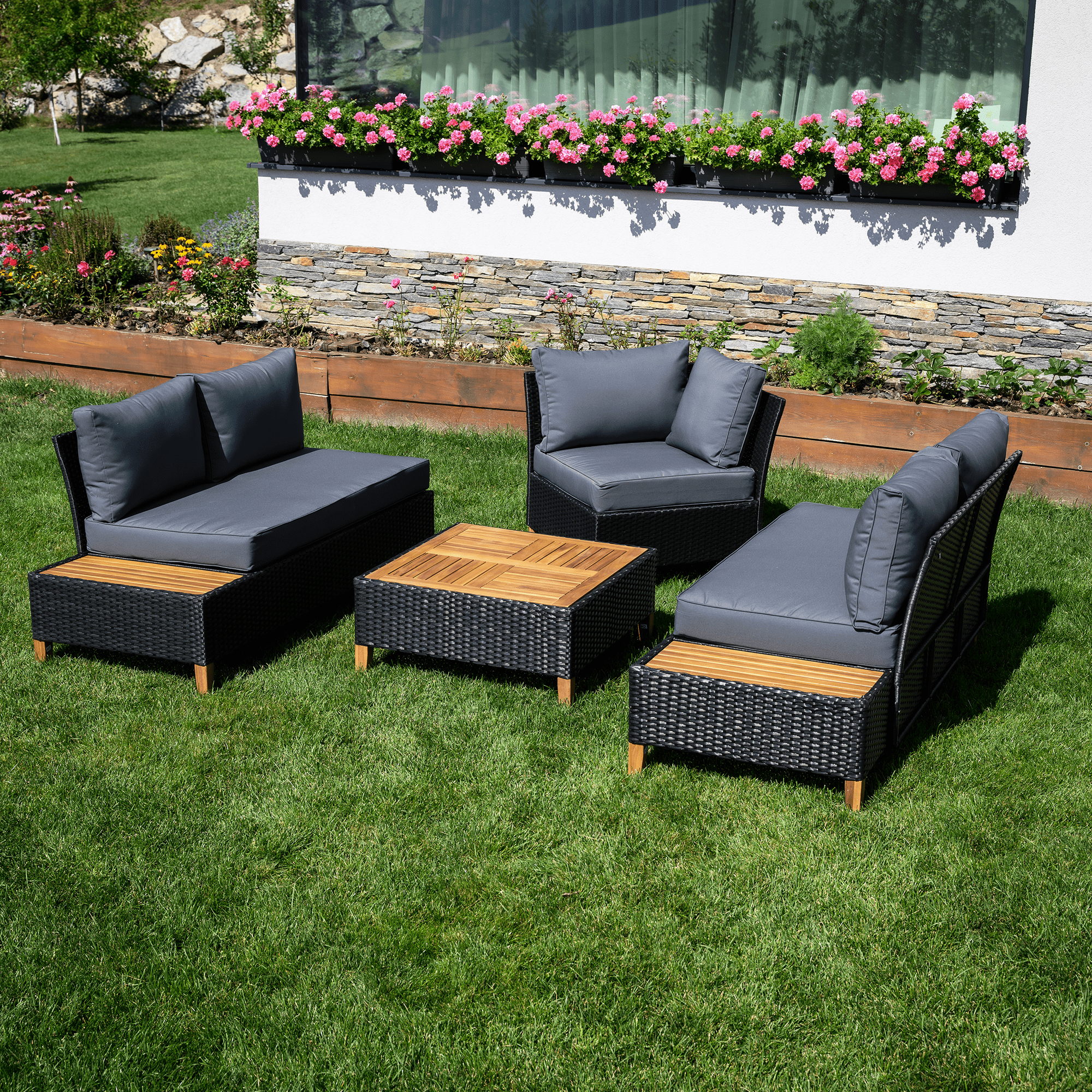 Záhradný ratanový set, akáciové drevo, čierna/sivá/prírodná, MALKOM