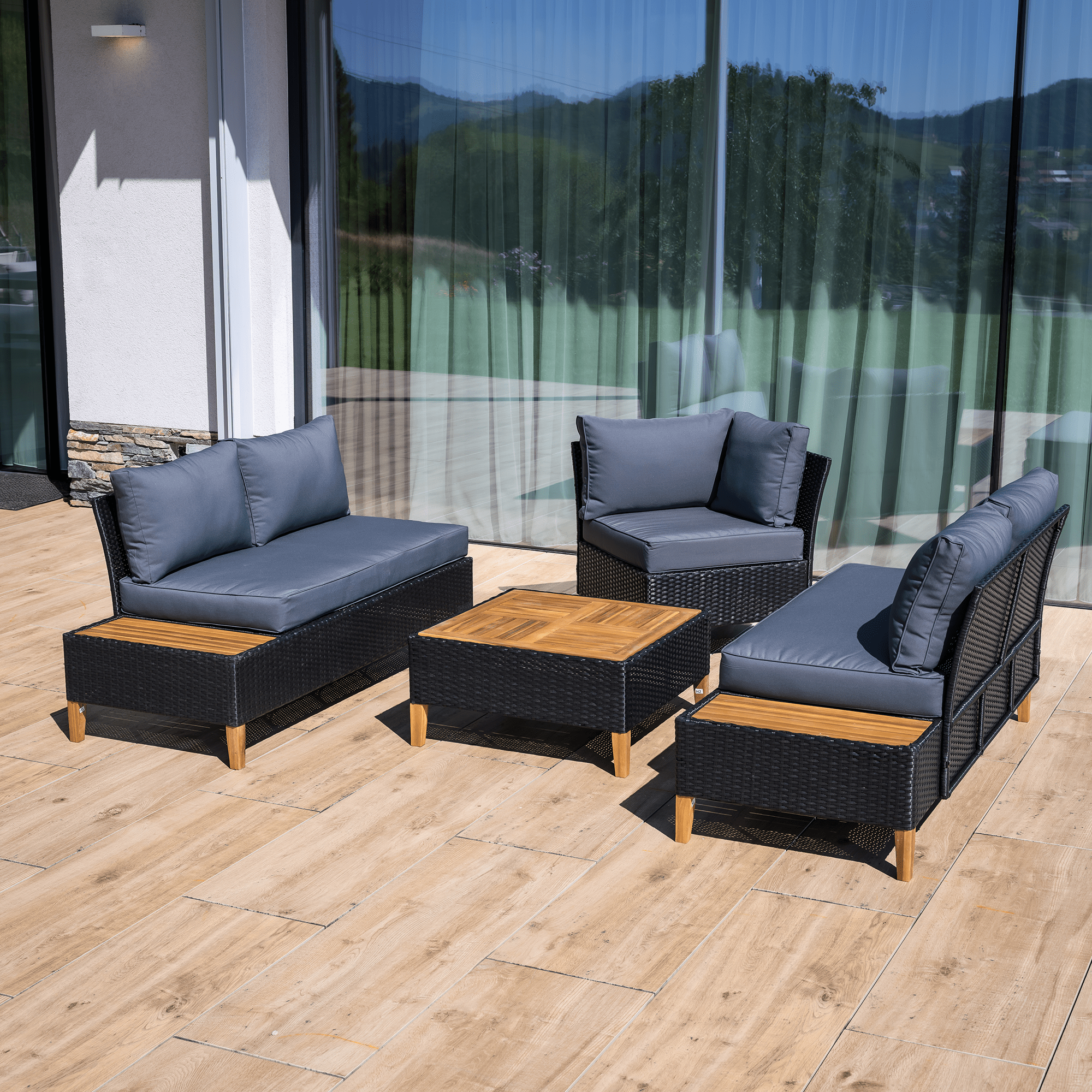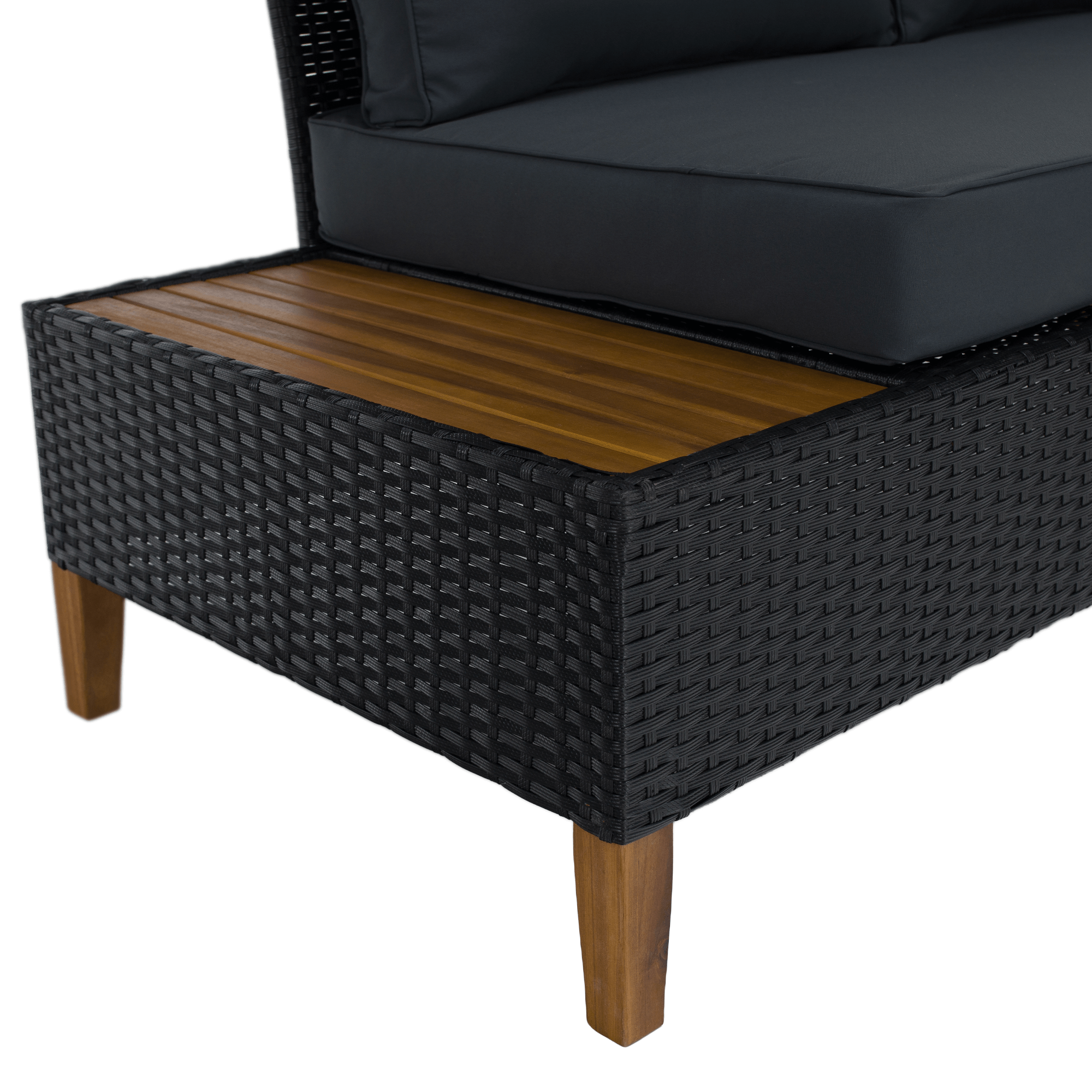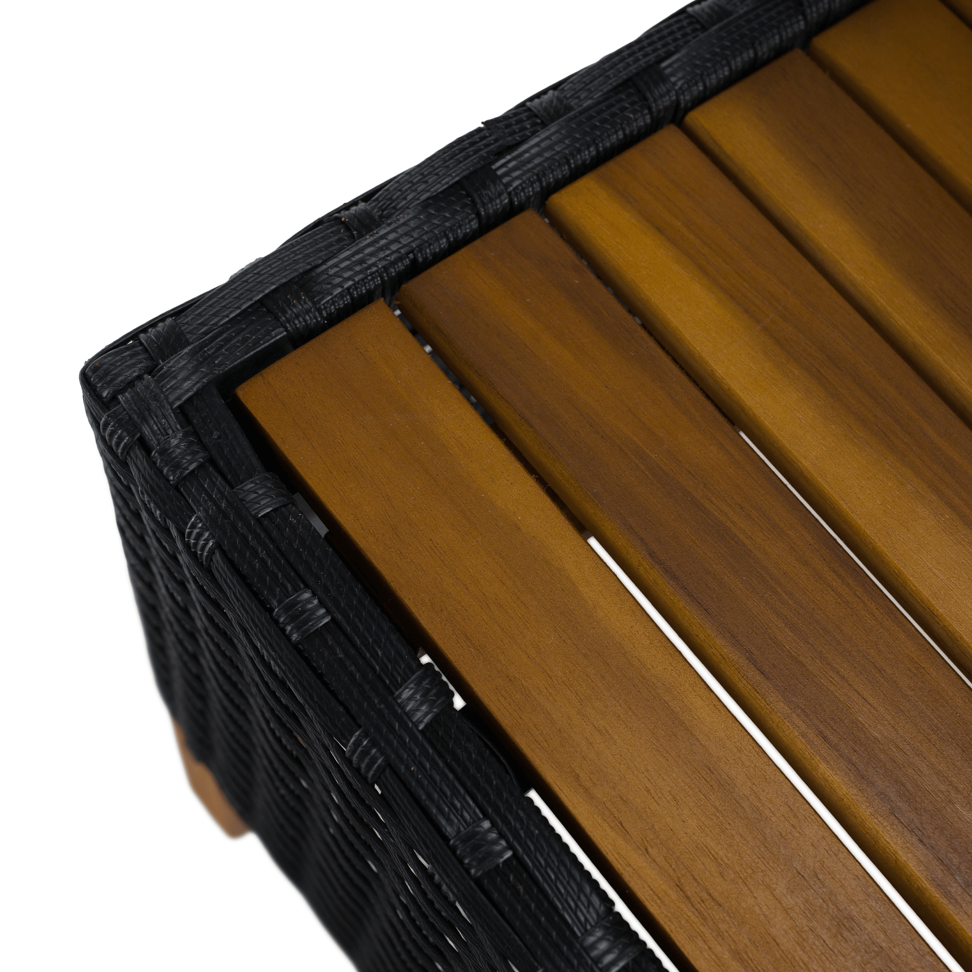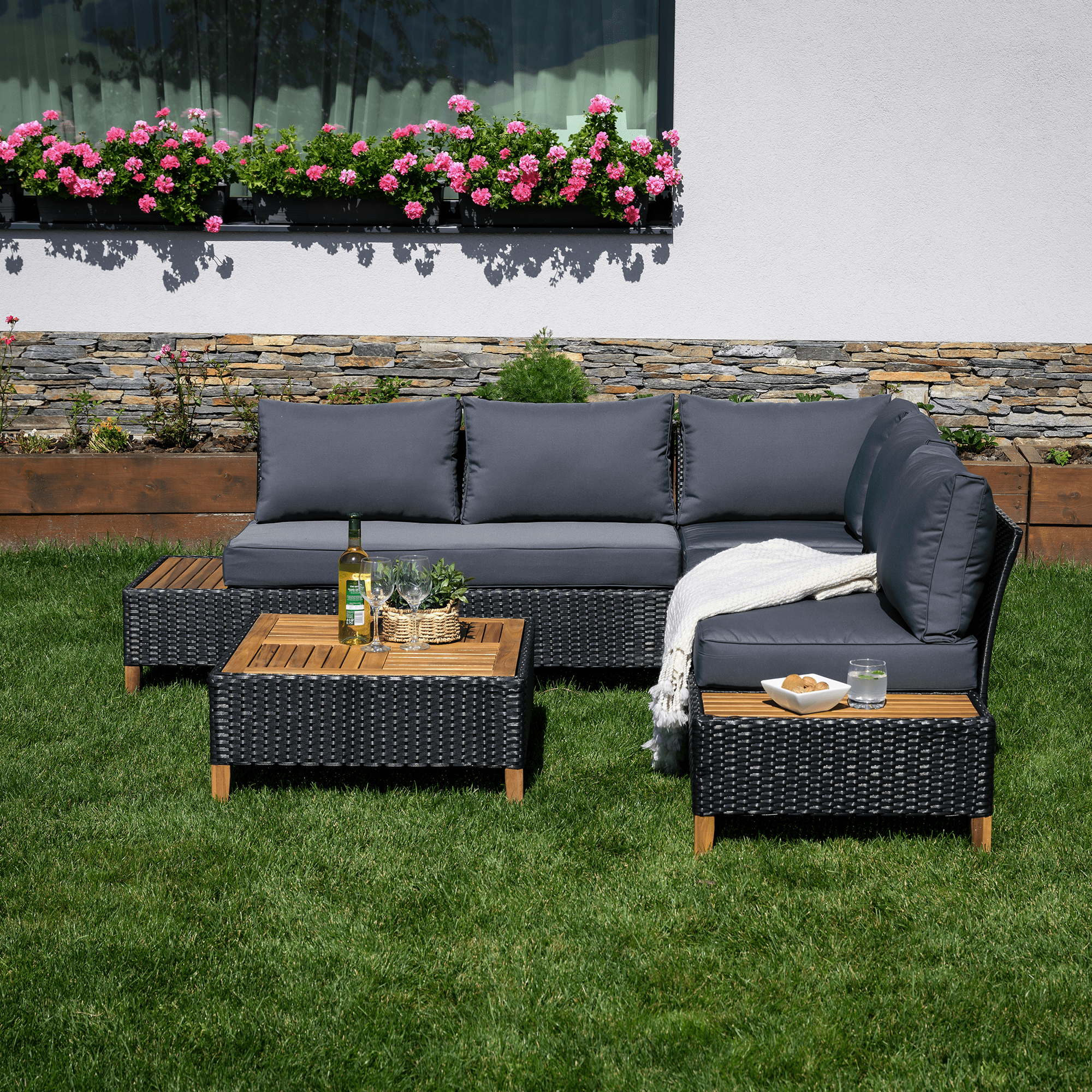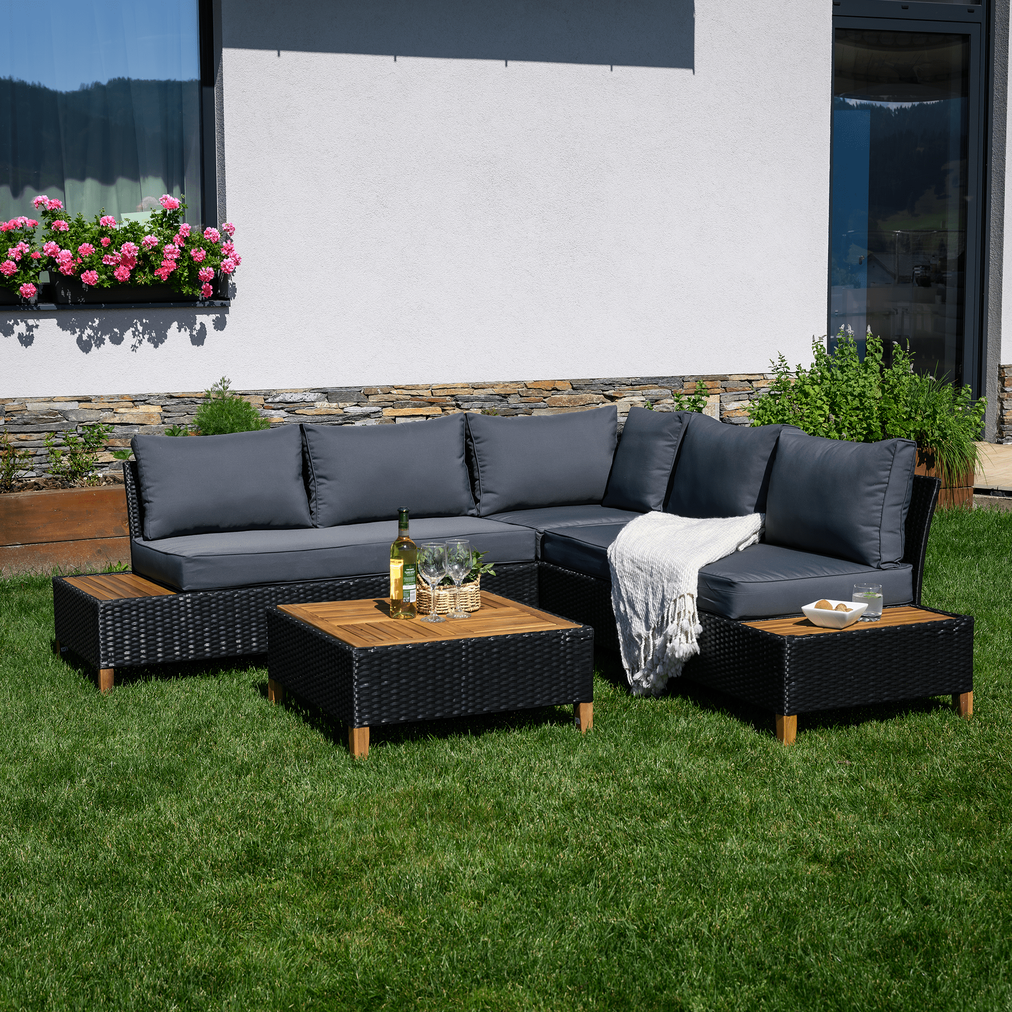 Záhradný ratanový set, akáciové drevo, čierna/sivá/prírodná, MALKOM