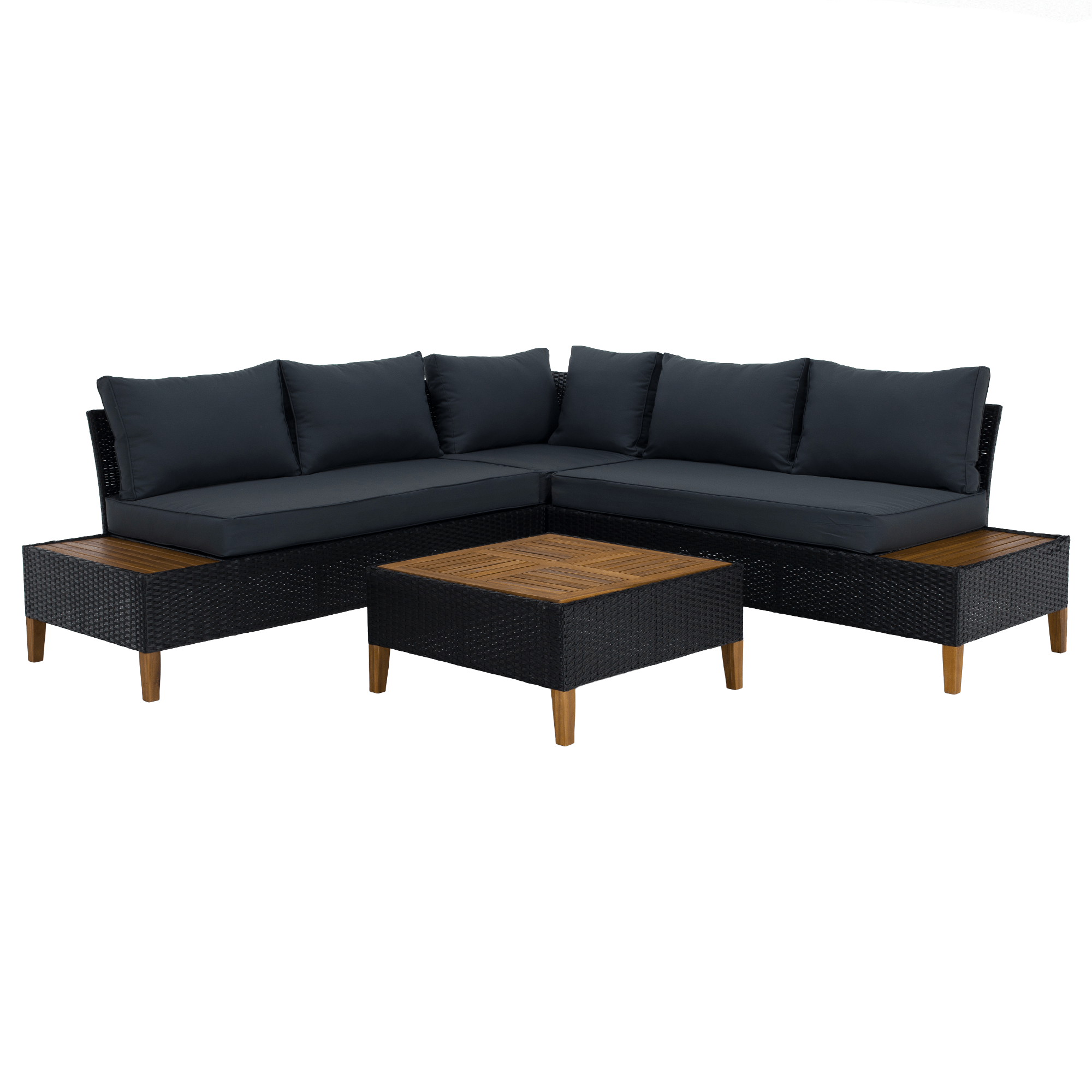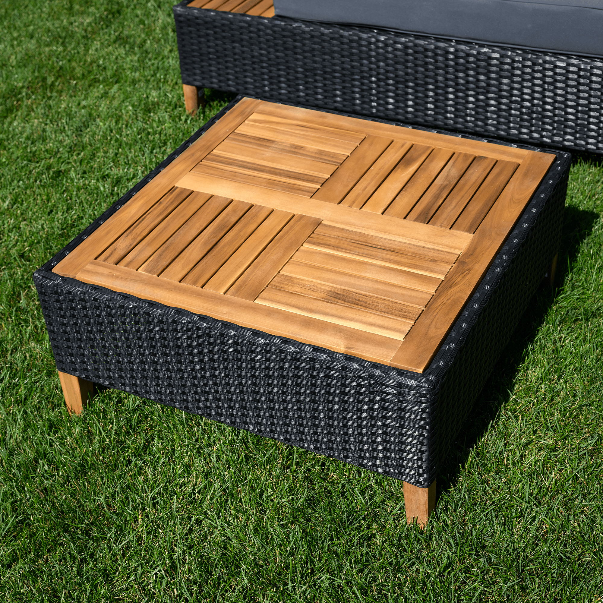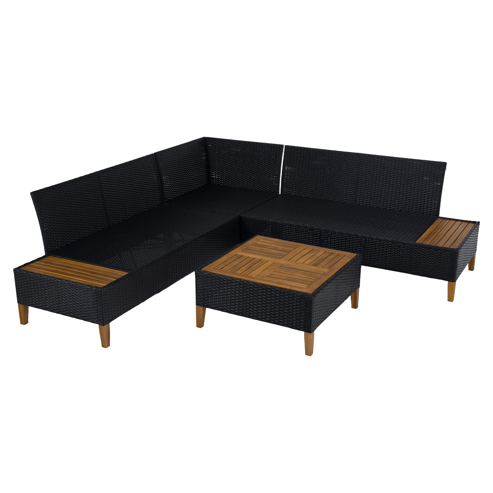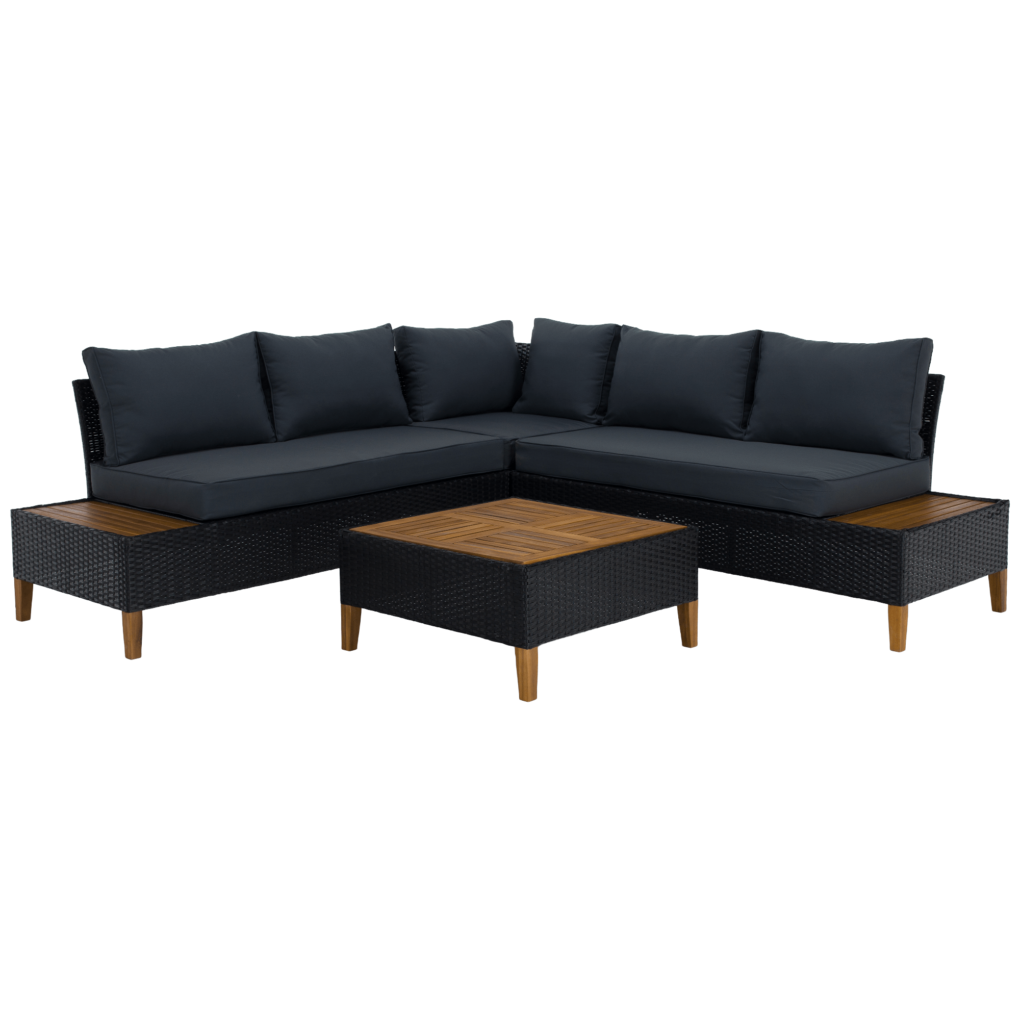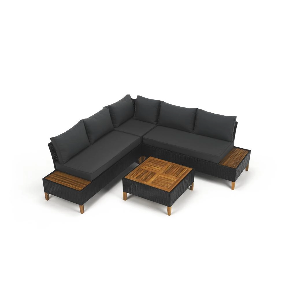 Záhradný ratanový set, akáciové drevo, čierna/sivá/prírodná, MALKOM