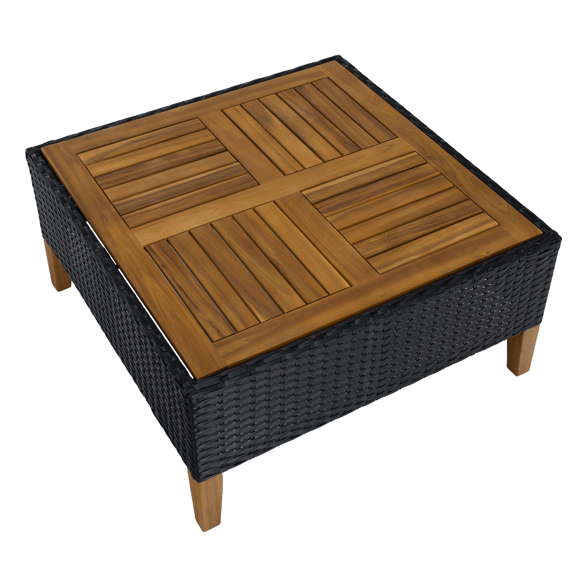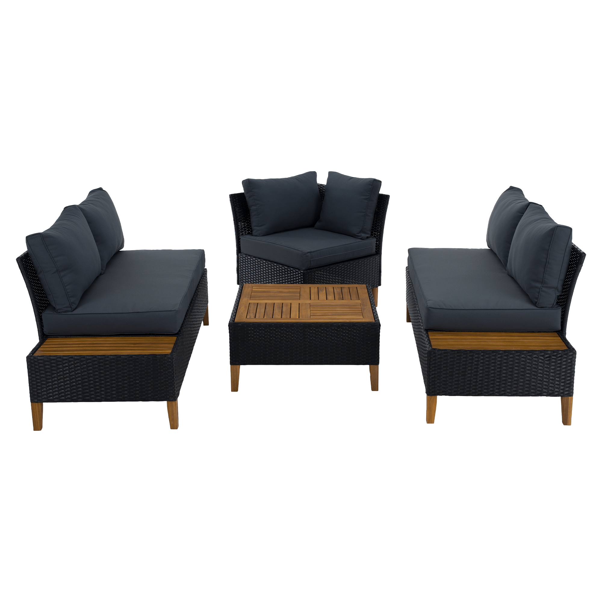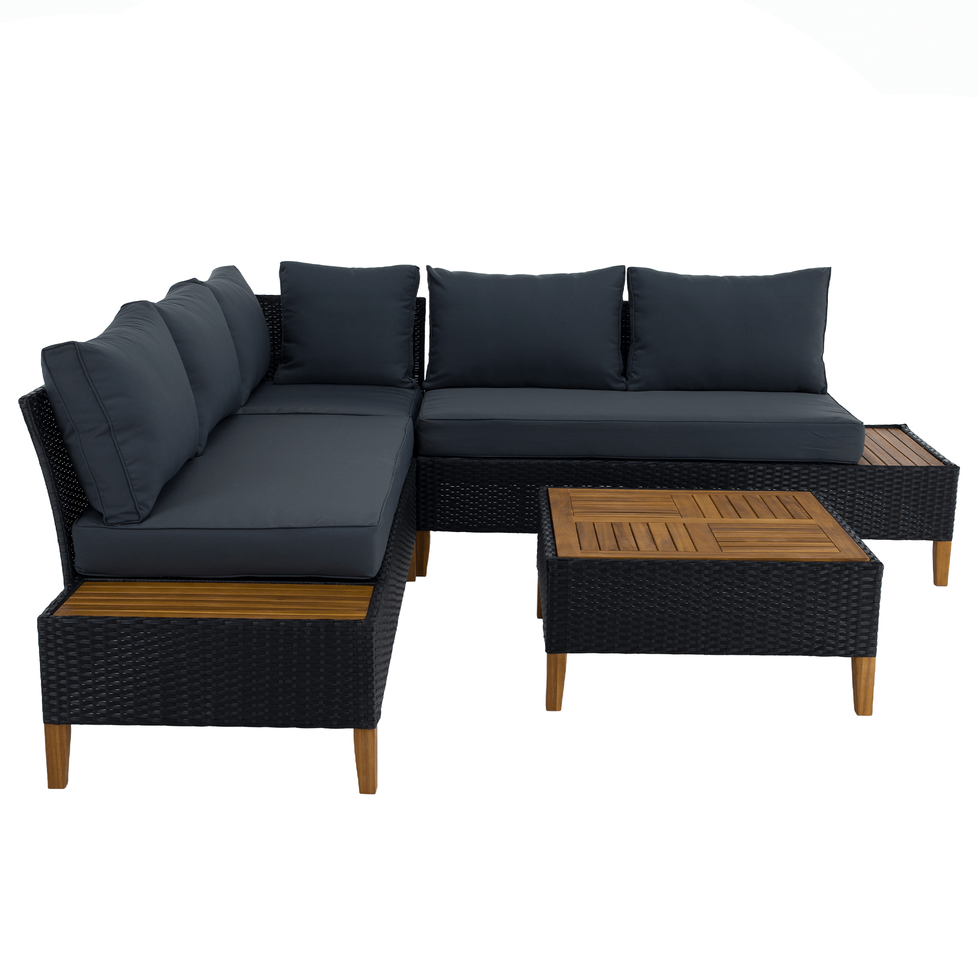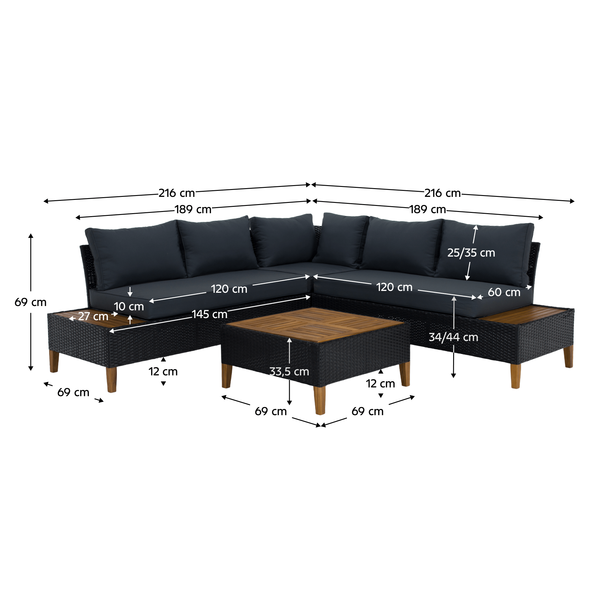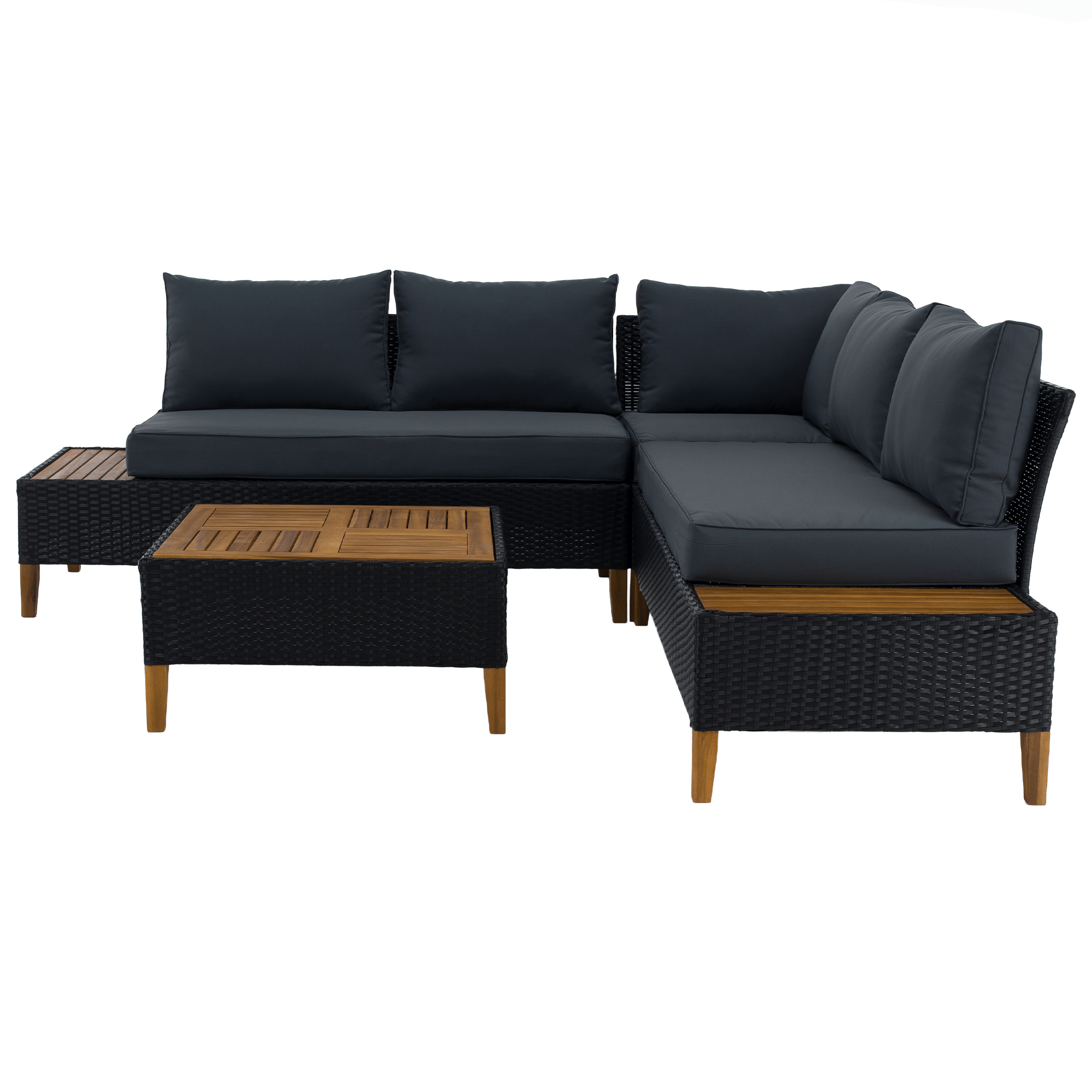 Záhradný ratanový set, akáciové drevo, čierna/sivá/prírodná, MALKOM