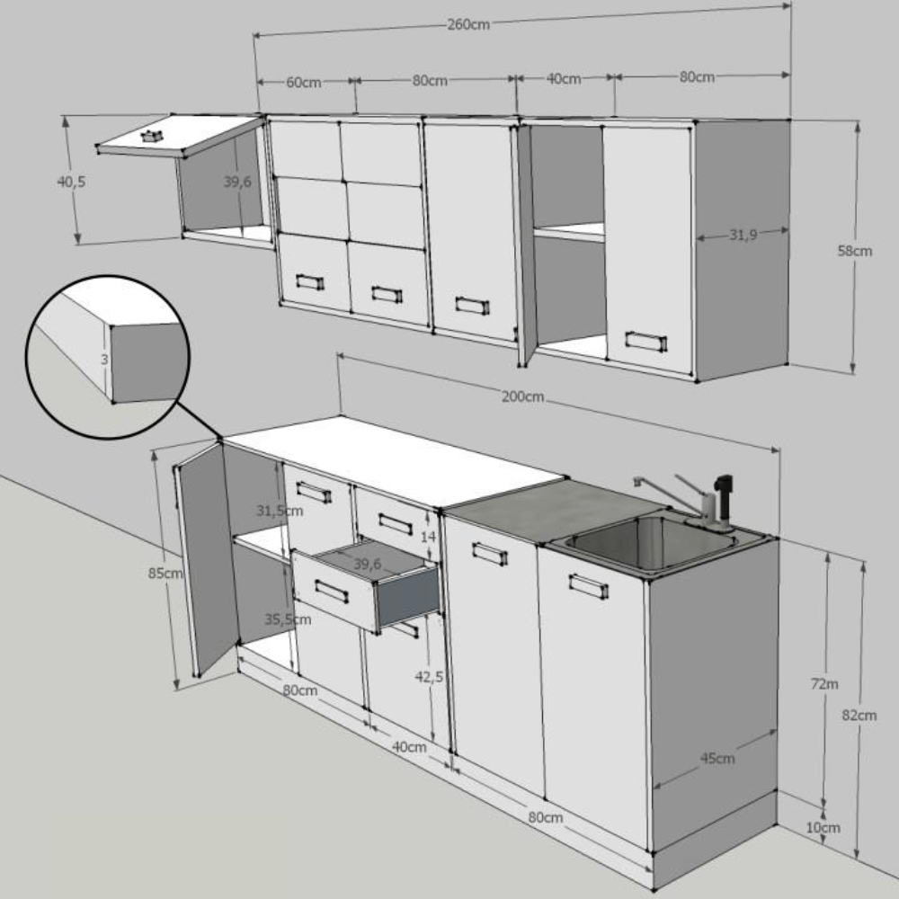 Horný rozmer aj s digestorovou skrinkou je 260 cm, dolný rozmer je 200 cm.