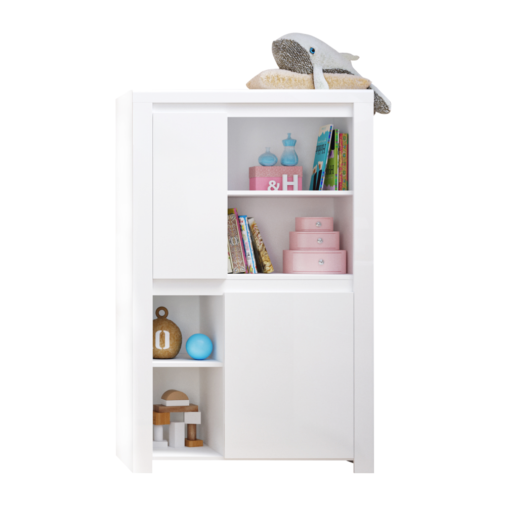 Obsahuje otvorené police a dve skrinky