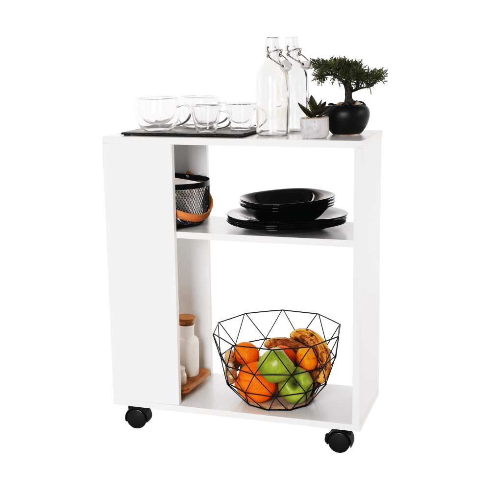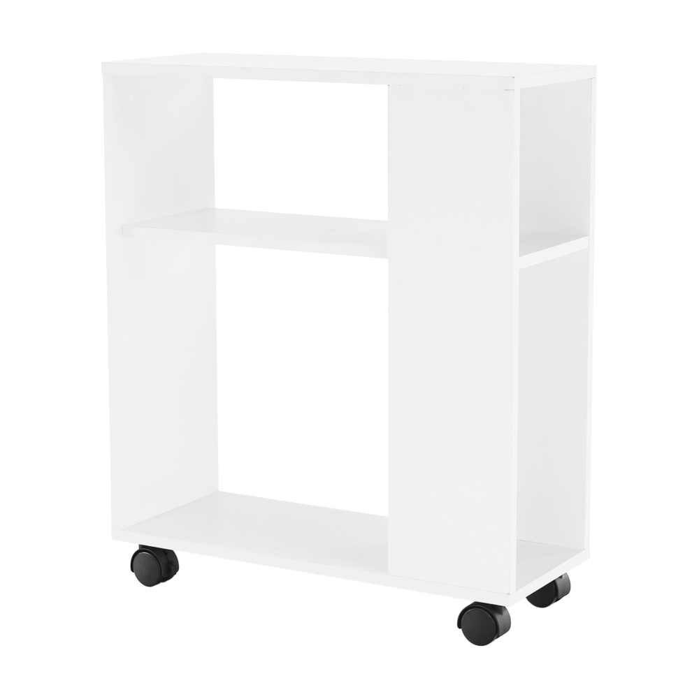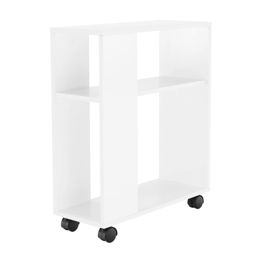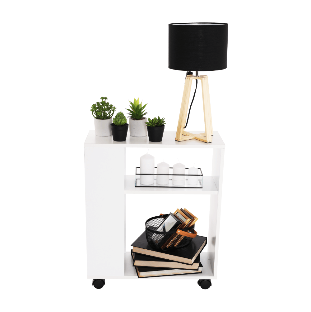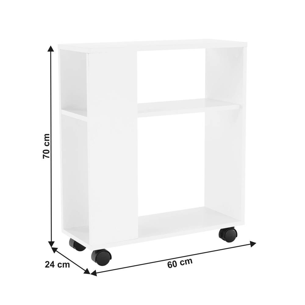 Príručný stolík s kolieskami v bielej farbe.