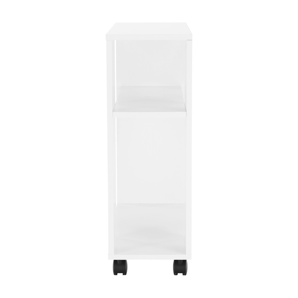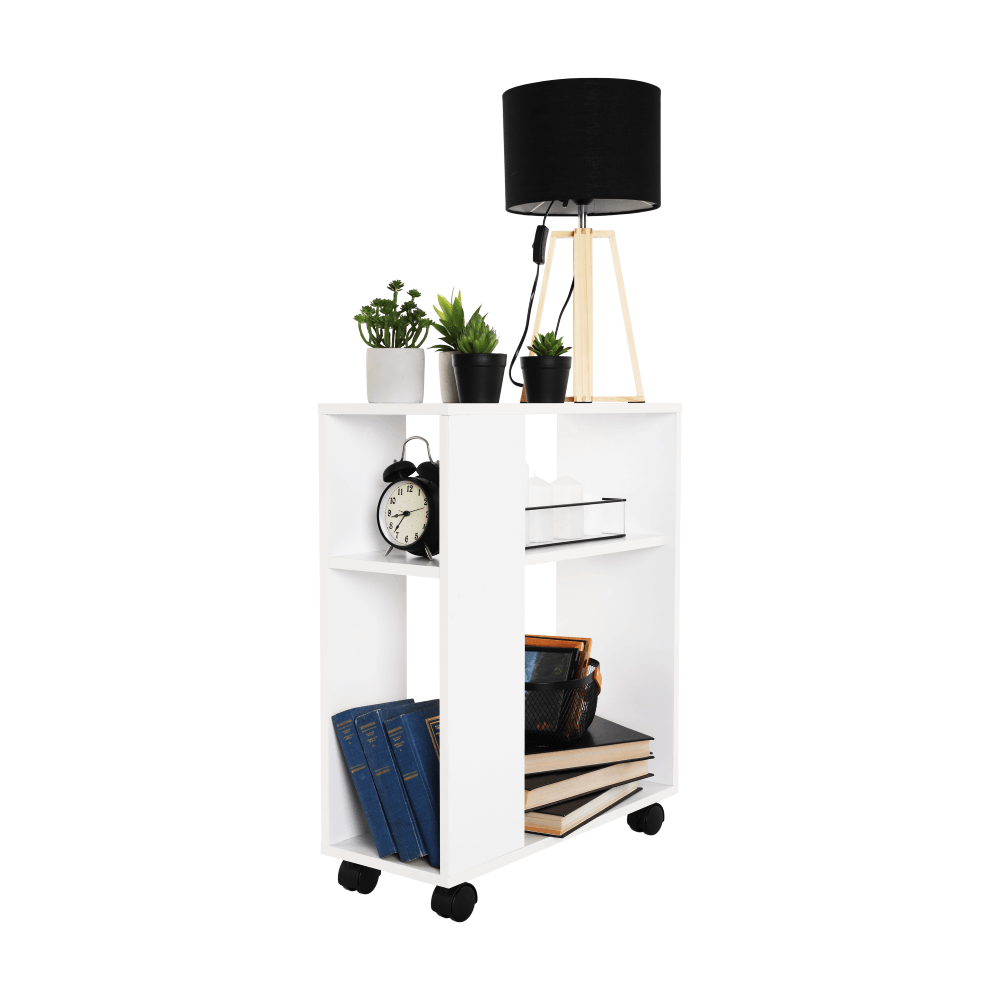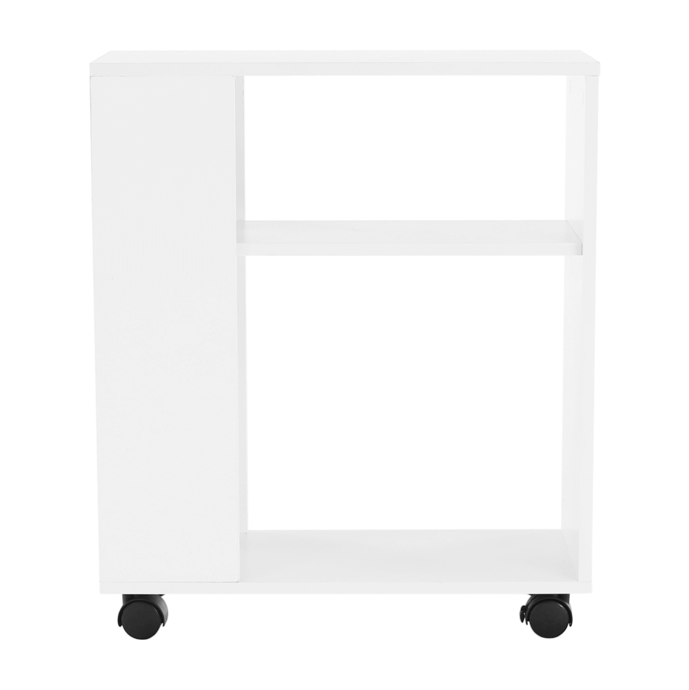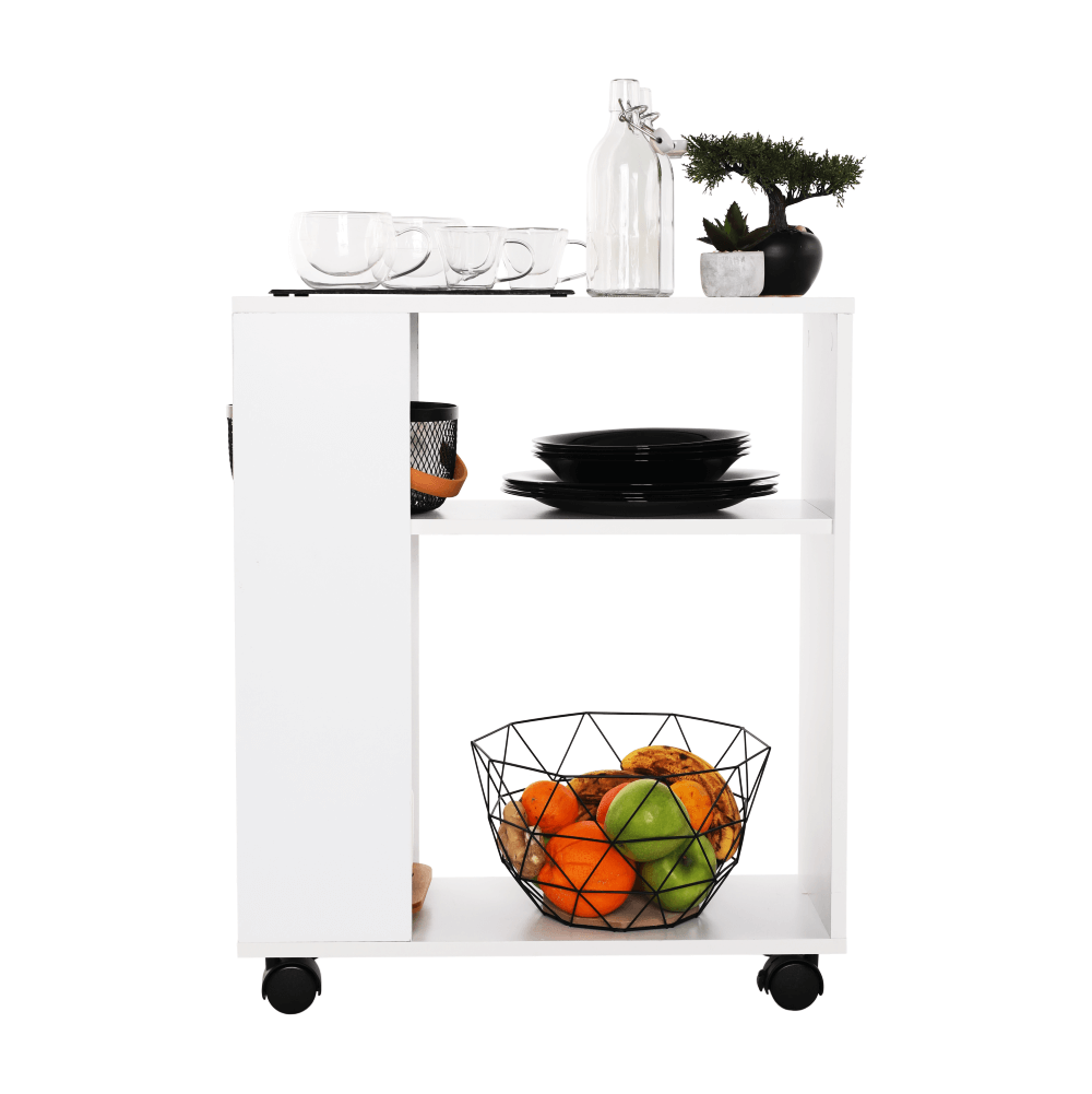 Príručný stolík s kolieskami v bielej farbe.