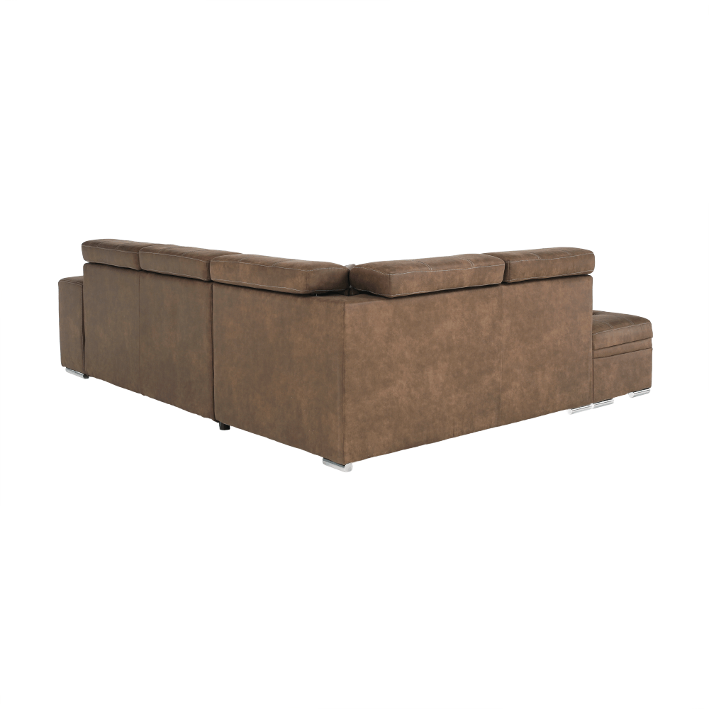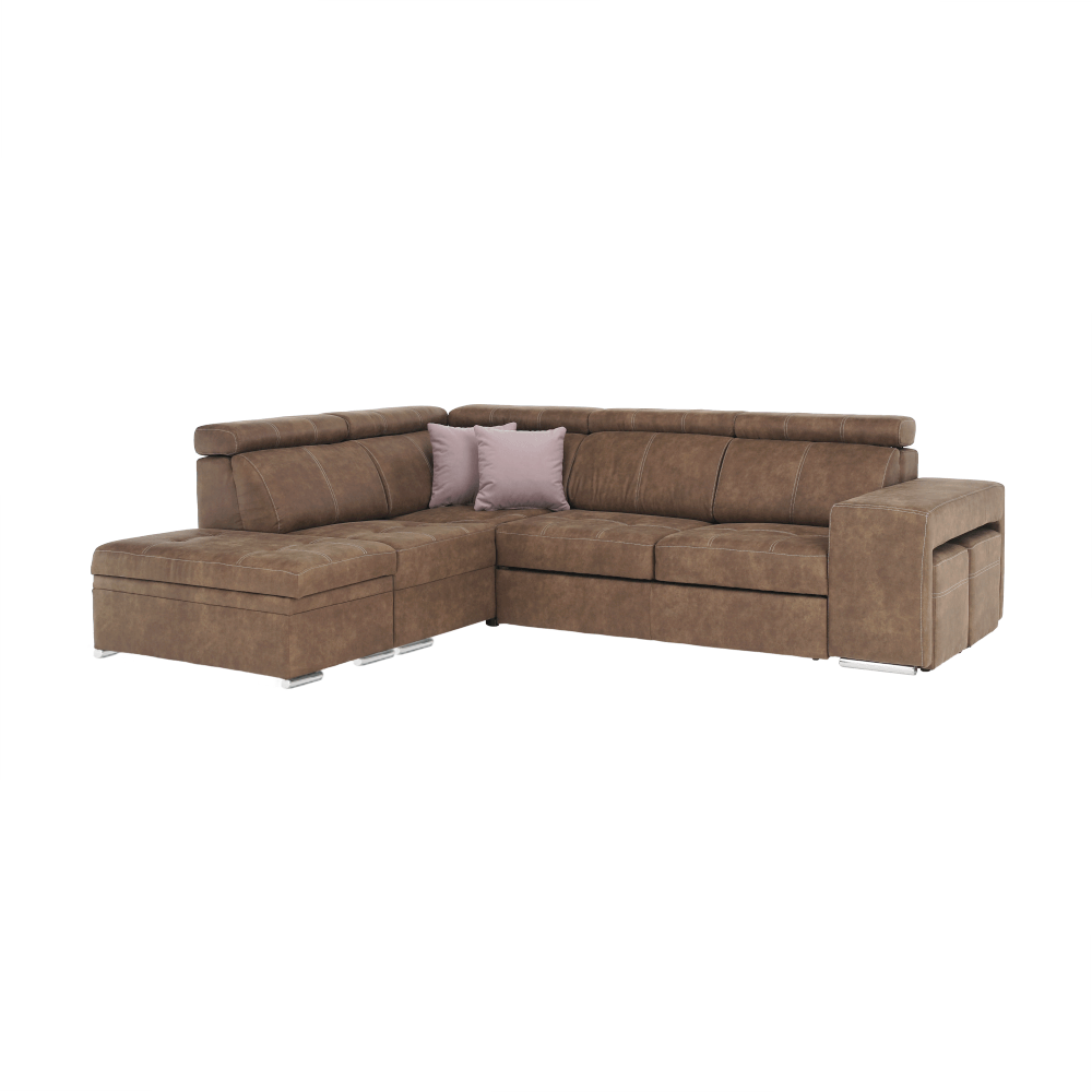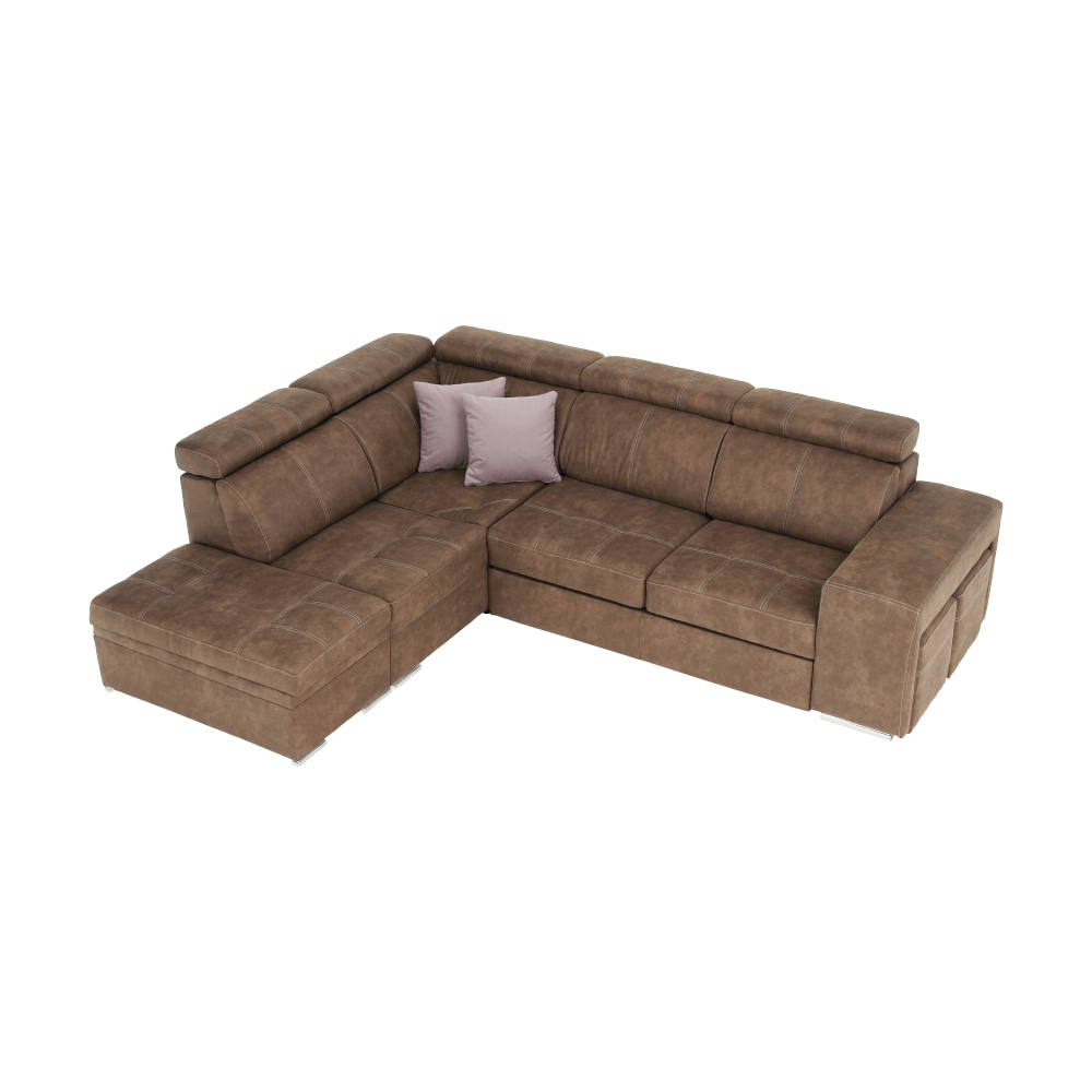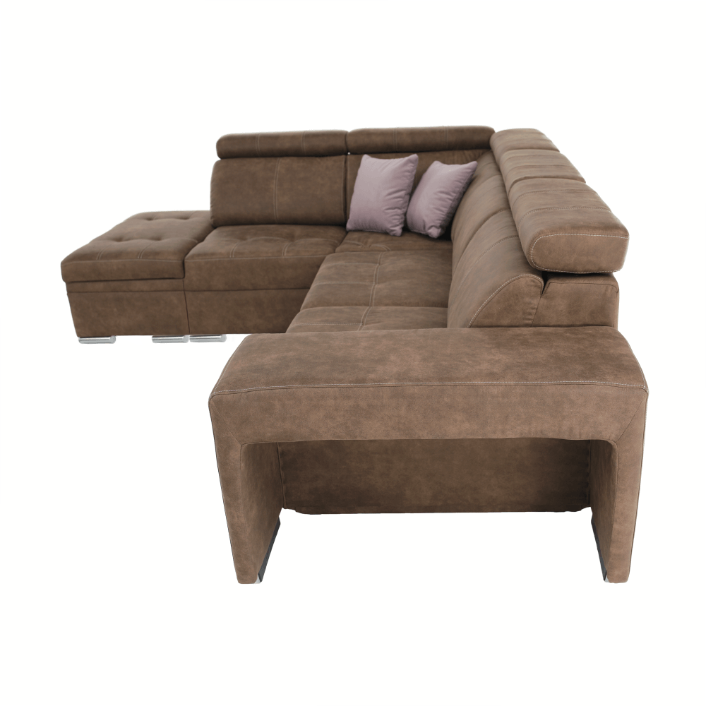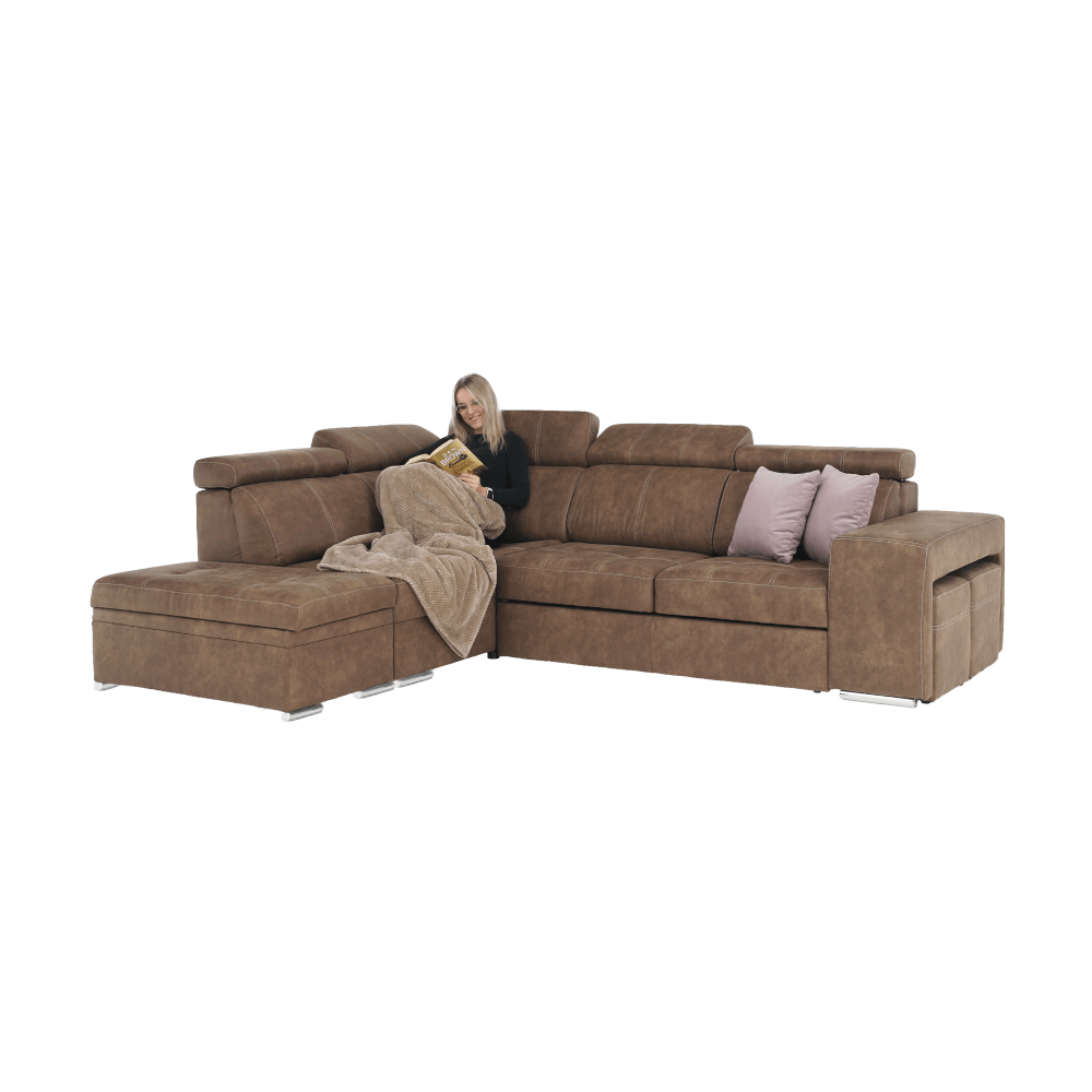 Celočalúnená rohová rozkladacia sedacia súprava s úložným priestorom a s polohovacím záhlavím.