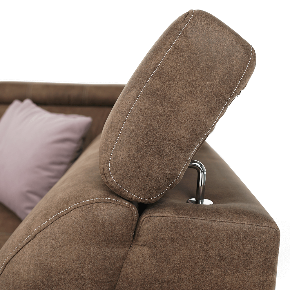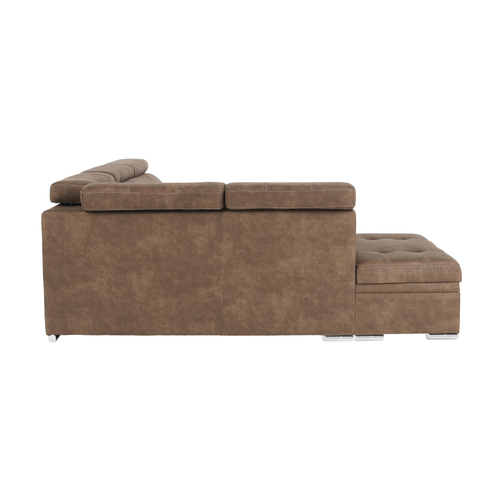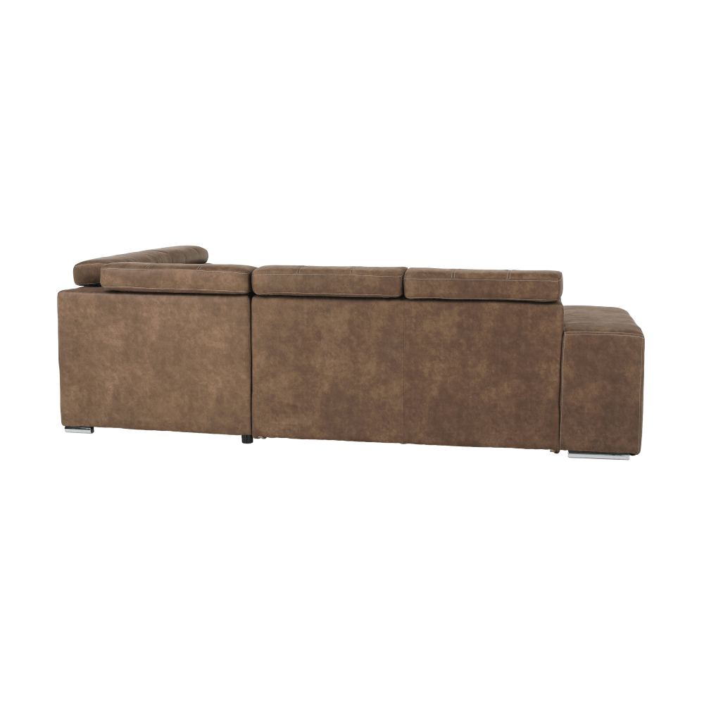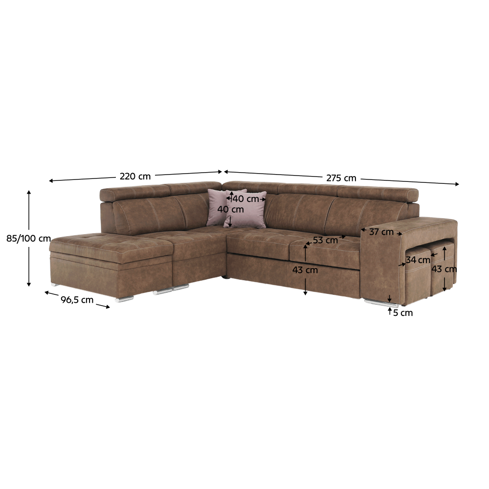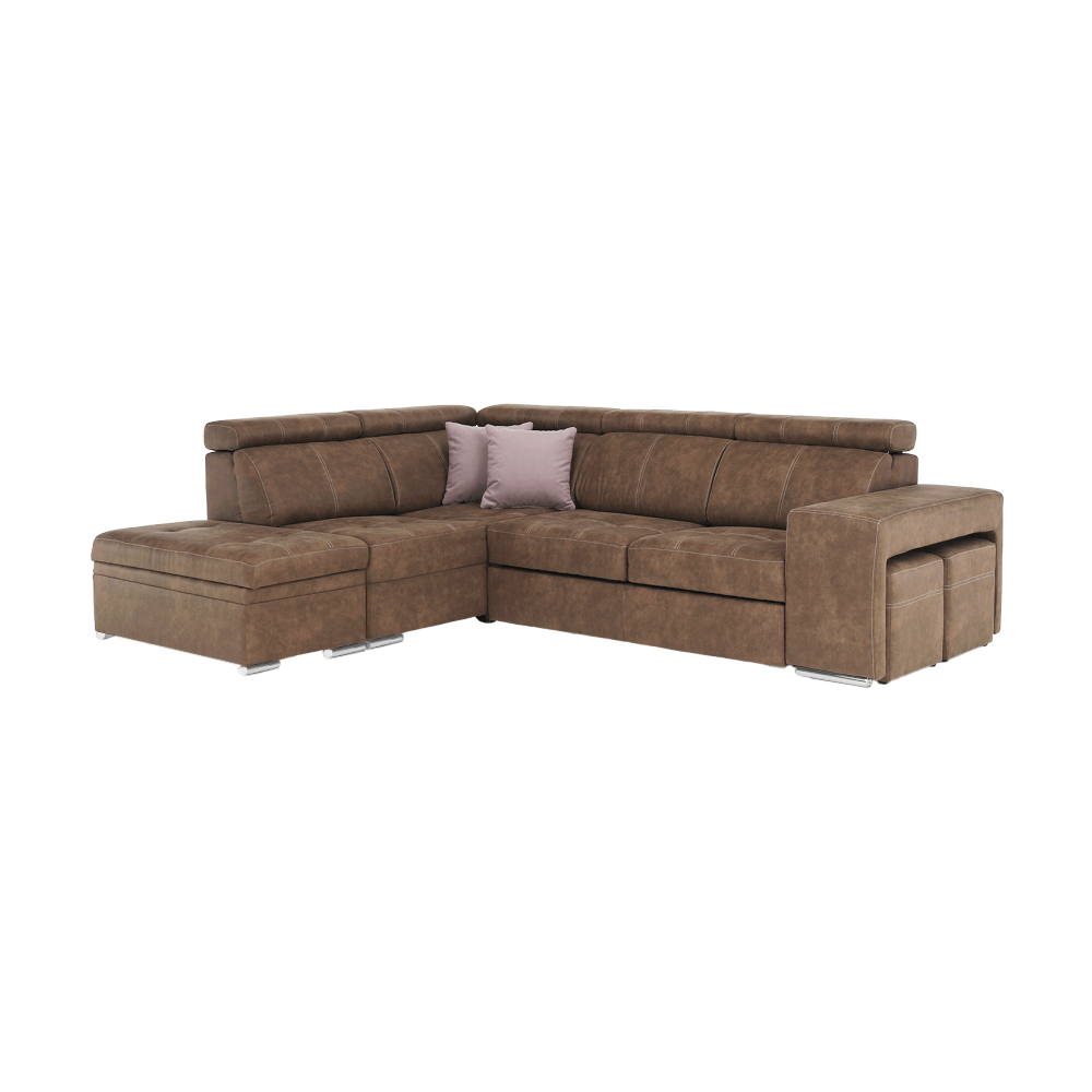 Celočalúnená rohová rozkladacia sedacia súprava s úložným priestorom a s polohovacím záhlavím.