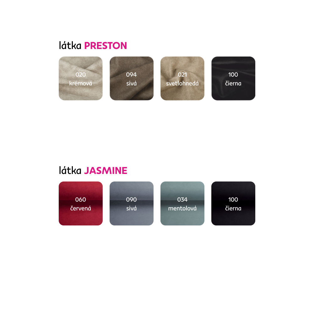 Možnosť objednania v 4 farebných prevedeniach látky Preston a Jasmine v cene: 1.519 Eur. Pri individuálnej objednávke je potrebné zaplatiť 20% zálohu z danej sumy. Po uhradení zálohy bude Vaša požiadavka zadaná do výroby. Dodacia lehota 6-8 týždňov.