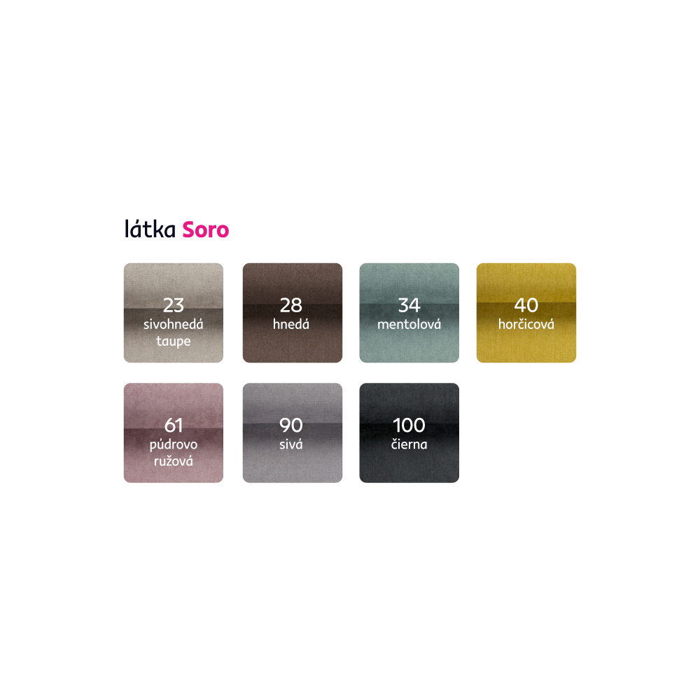 Ponúkame vám možnosť objednať si sedačku v 7 farebných prevedeniach látky Soro podľa vzorkovníka. Váš výber napíšte priamo do poznámky v objednávke. Cena sedačky na individuálnu objednávku je verzia s rozkladom a úložným priestorom BUTON R 1.529 Eur a pevná verzia bez úložného priestoru BUTON P 1.409 Eur. Pri individuálnej objednávke je potrebné zaplatiť 20% zálohu z danej sumy. Po uhradení zálohy bude Vaša požiadavka zadaná do výroby. Doba dodania 6-8 týždňov.