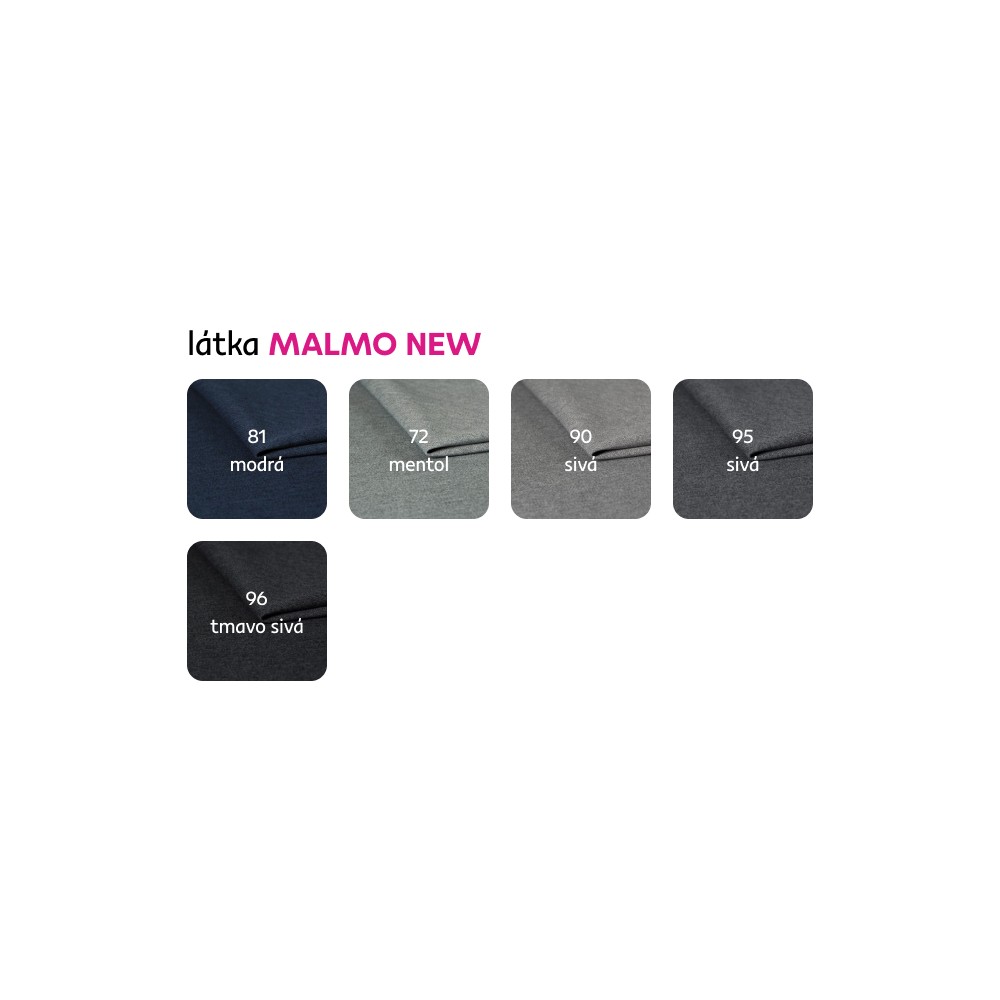 Ponúkame vám možnosť vybrať si z 5 farebných prevedení látky Malmo New. Pri individuálnej objednávke je potrebné zaplatiť 20% zálohu z danej sumy. Po uhradení zálohy bude Vaša požiadavka zadaná do výroby. Dodacia lehota 6-8 týždňov.